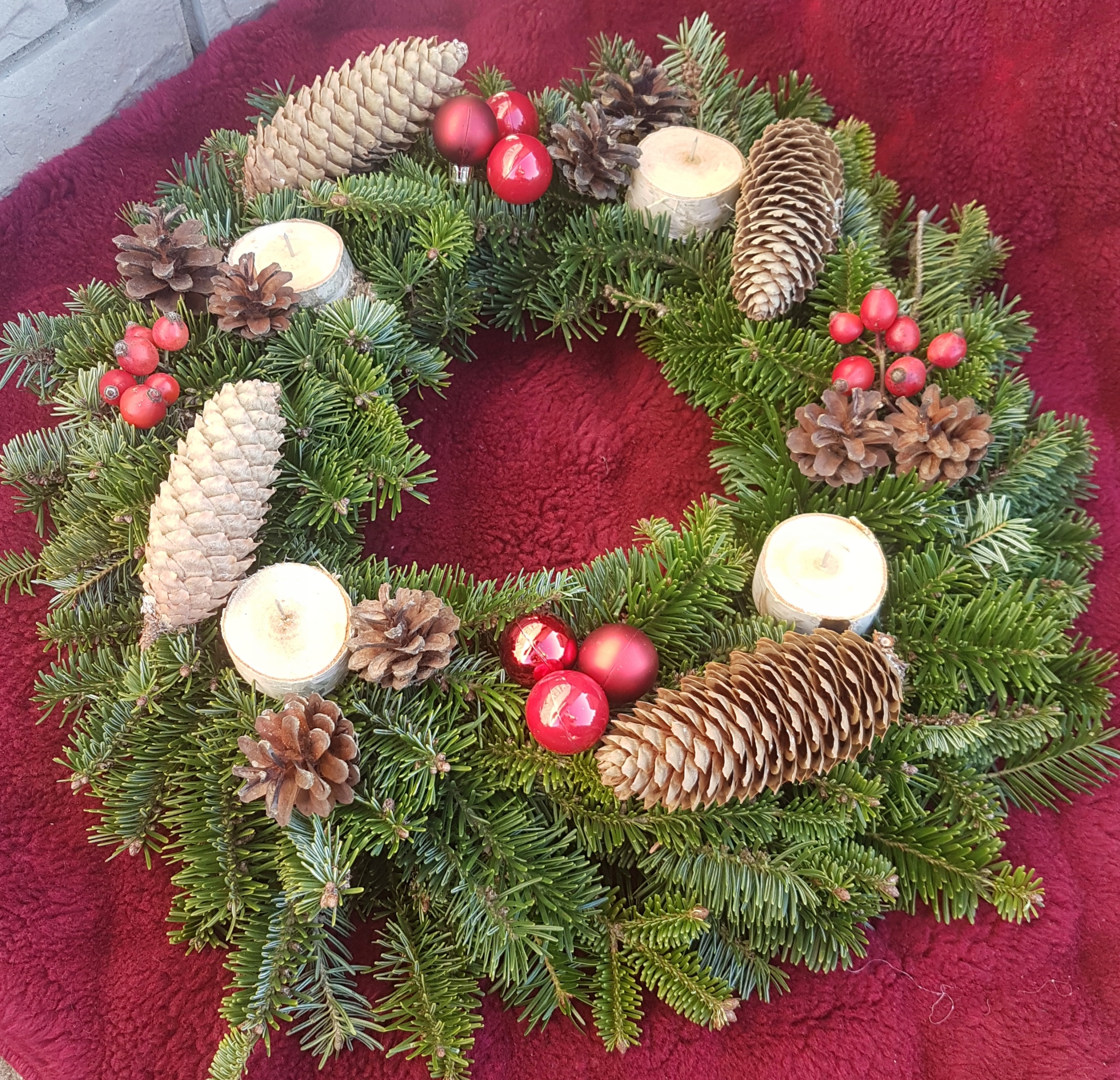 Венок выполнен из живых еловых веток, украшен: сосновыми и еловыми шишками, ягодами шиповника и красными безделушками. Кроме того, имеются деревянные подставки для свечи.