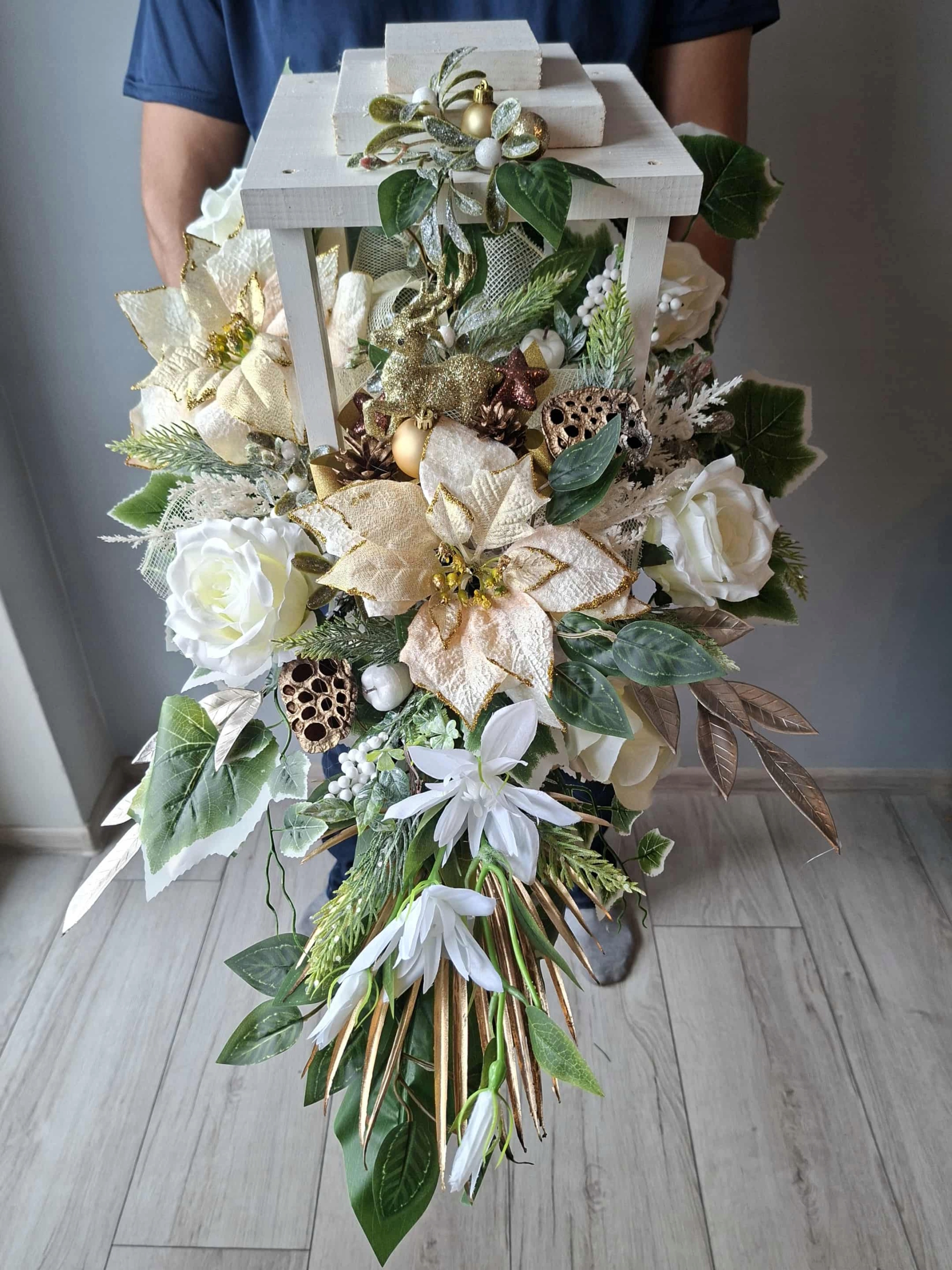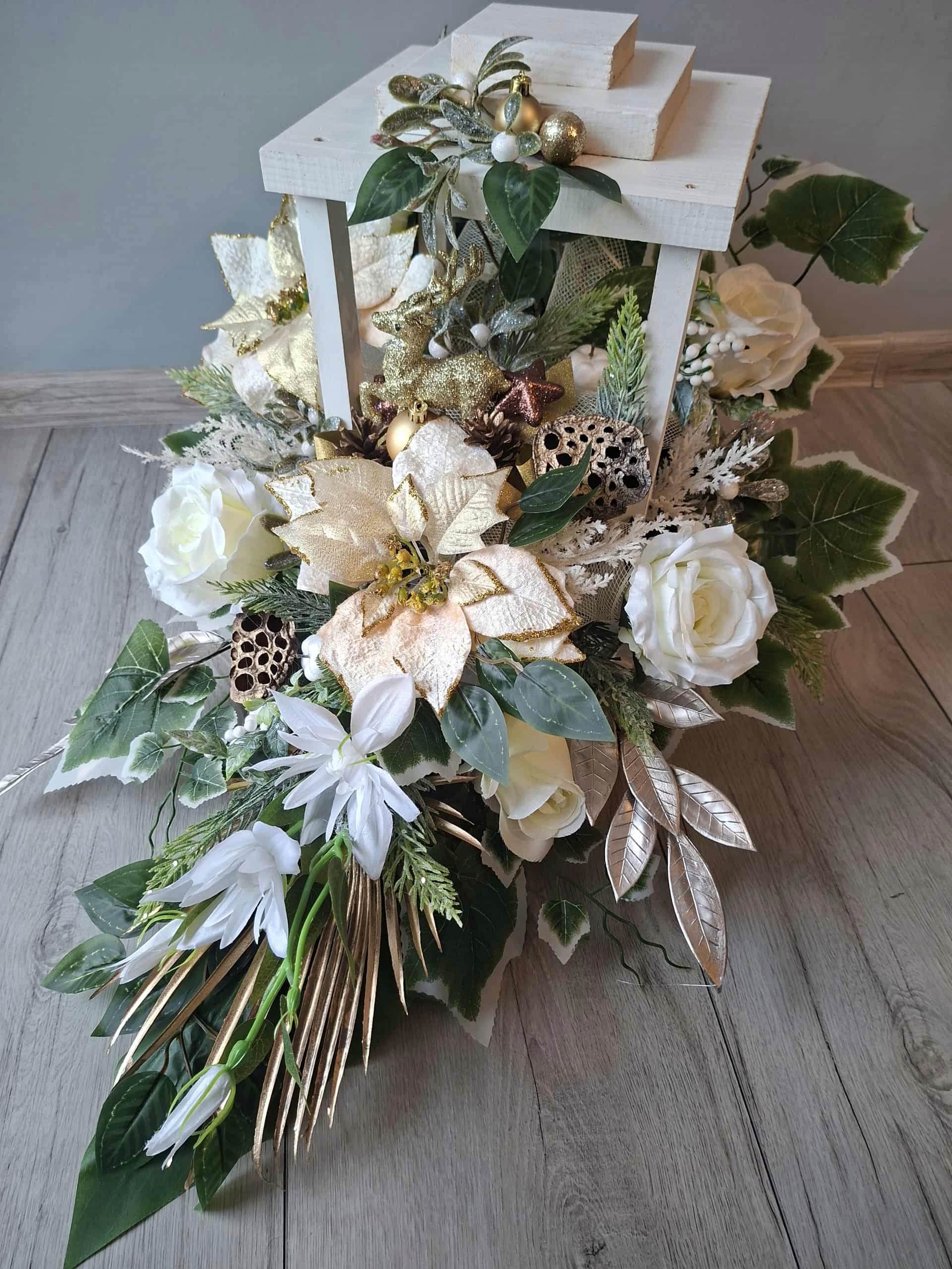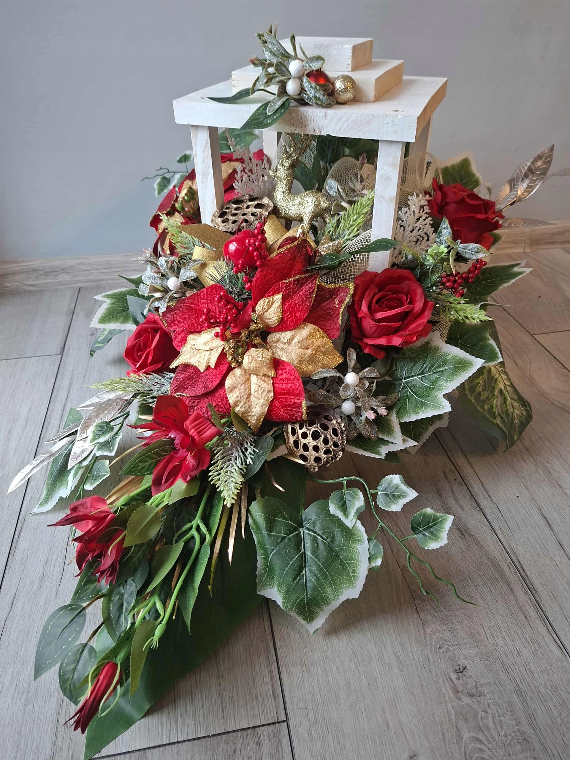 Искусственная композиция (т. н. венок, икебана) изготавливается из искусственной елки, забетонированной в пластиковом горшке, помещенном в деревянный ФОНАРЬ, что придает ей устойчивость. Бетон придает ему соответствующий вес, что предотвращает скольжение могильной композиции. Состав ок. Длина 60 см, высота 45 см.