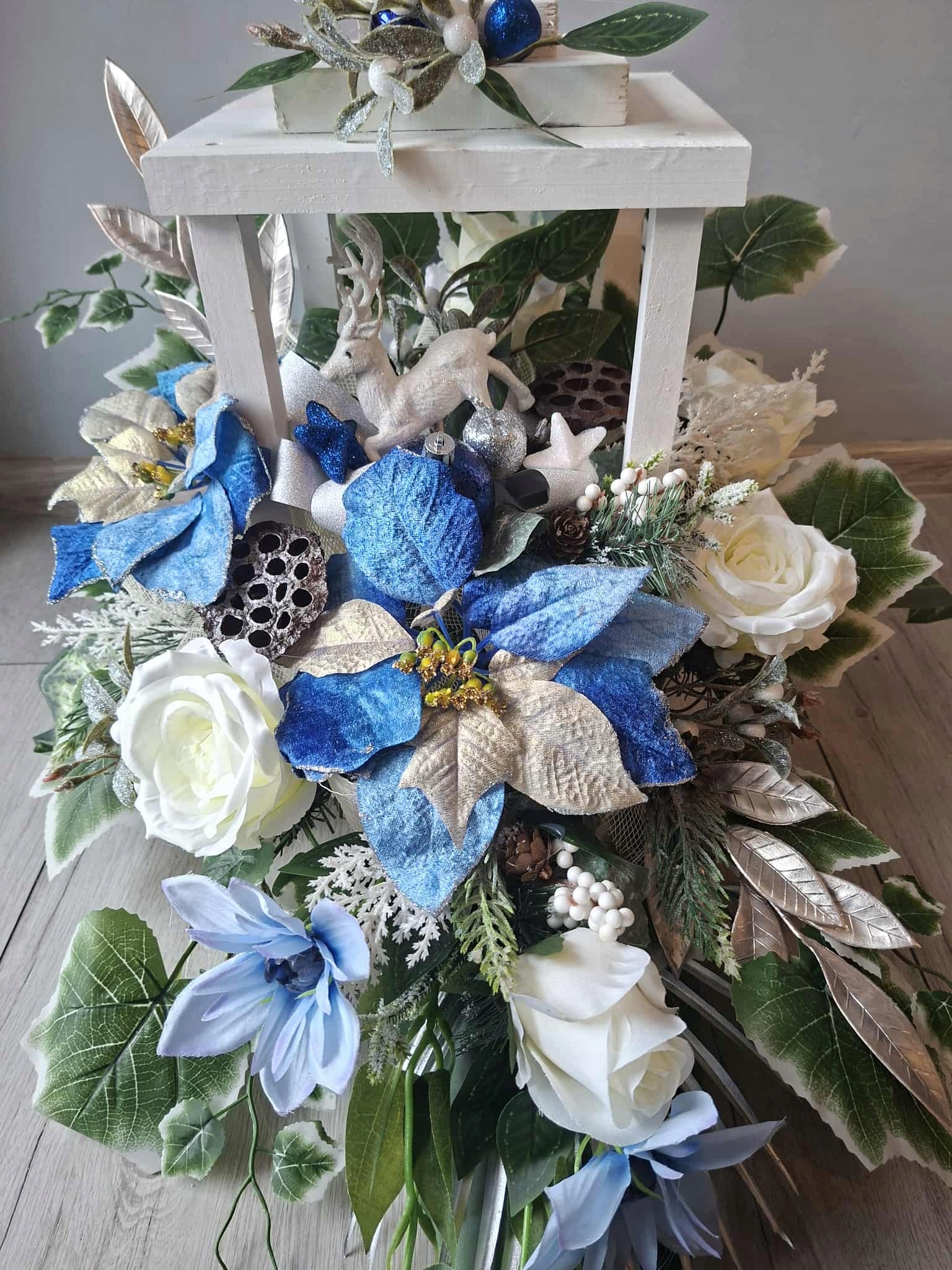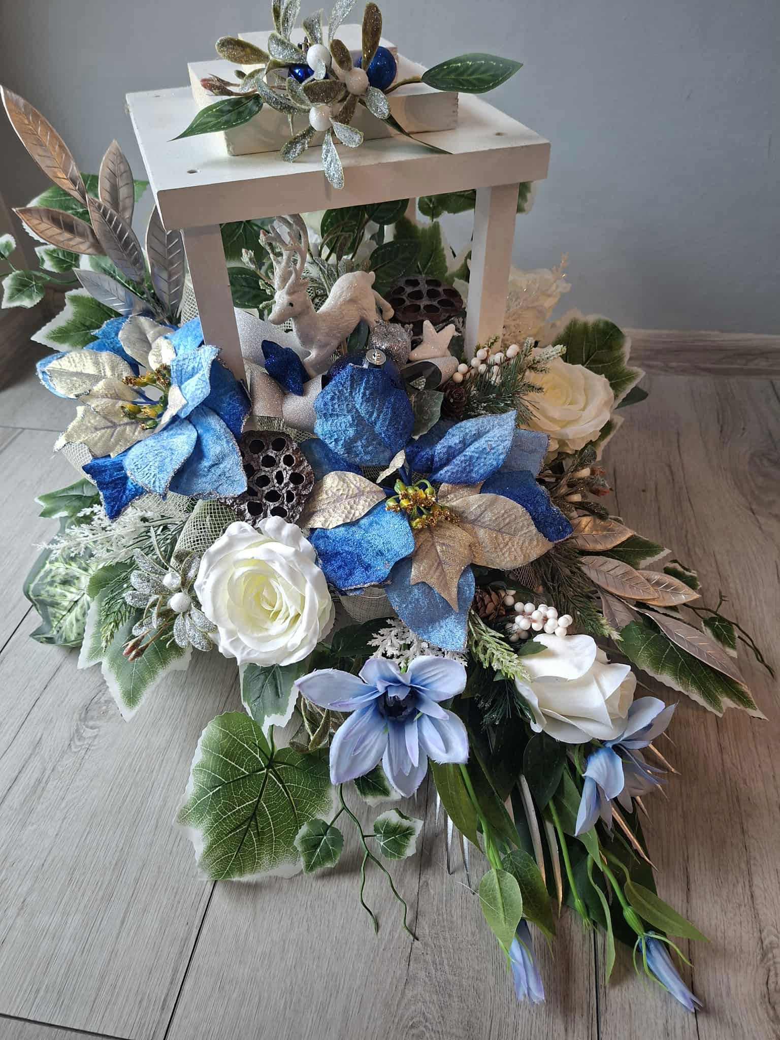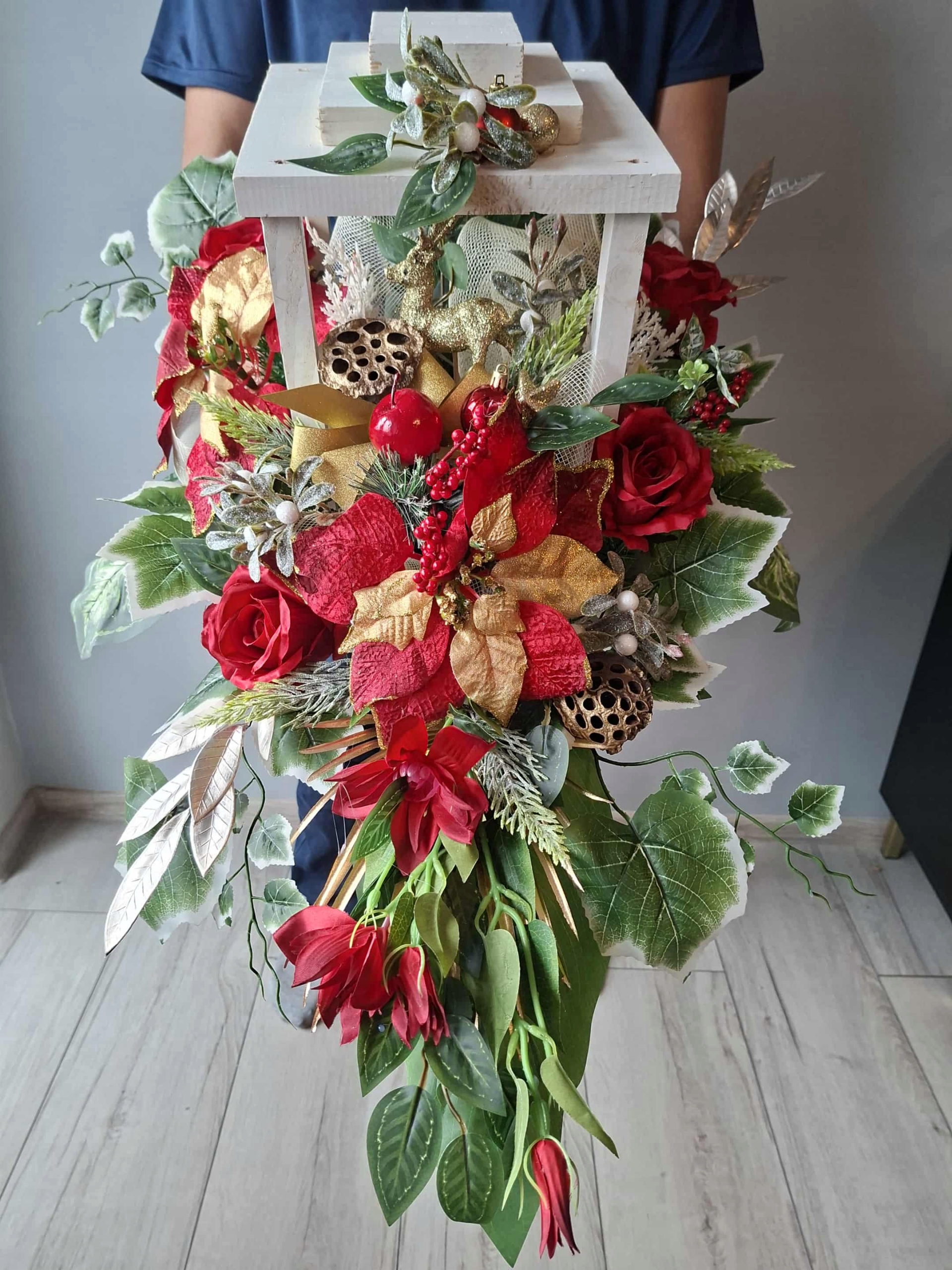Искусственная композиция (т. н. венок, икебана) изготавливается из искусственной елки, забетонированной в пластиковом горшке, помещенном в деревянный ФОНАРЬ, что придает ей устойчивость. Бетон придает ему соответствующий вес, что предотвращает скольжение могильной композиции. Состав ок. Длина 60 см, высота 45 см.