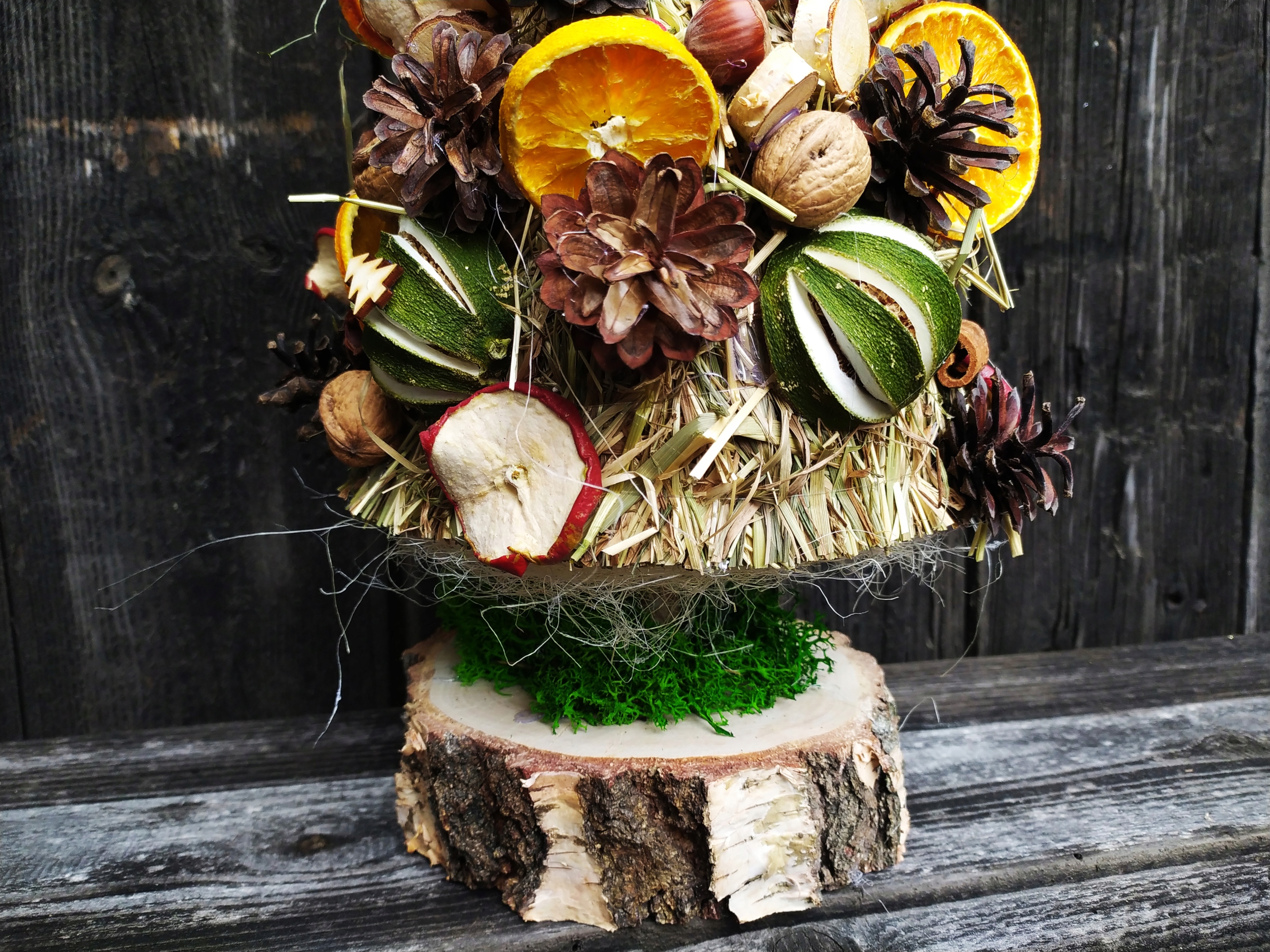 - из натуральных материалов: сено, кусочки дерева, орехи, натуральная корица, сушеные апельсины и яблоки, ароматный анис, шишки оленьей сосны, деревянный декор