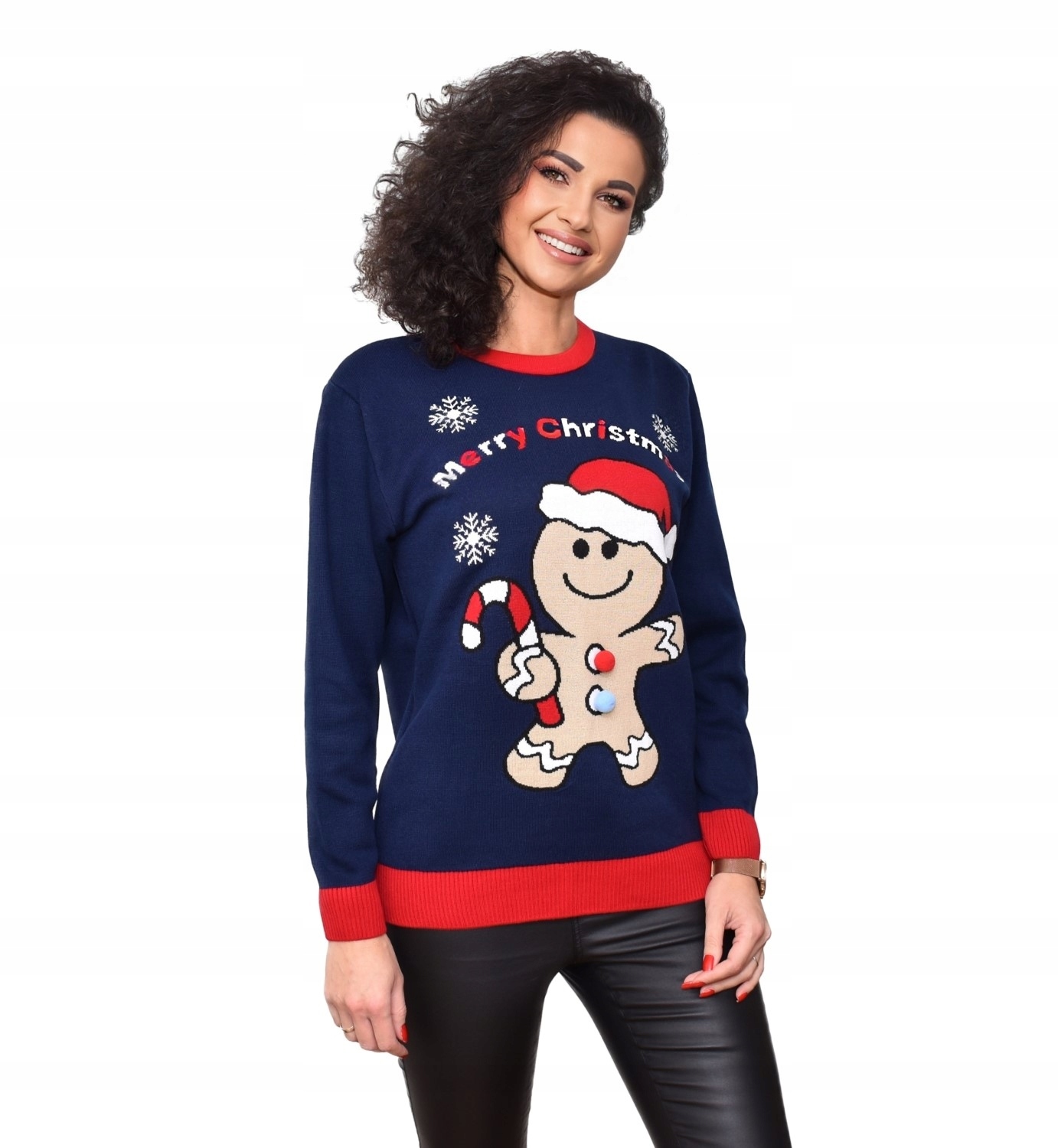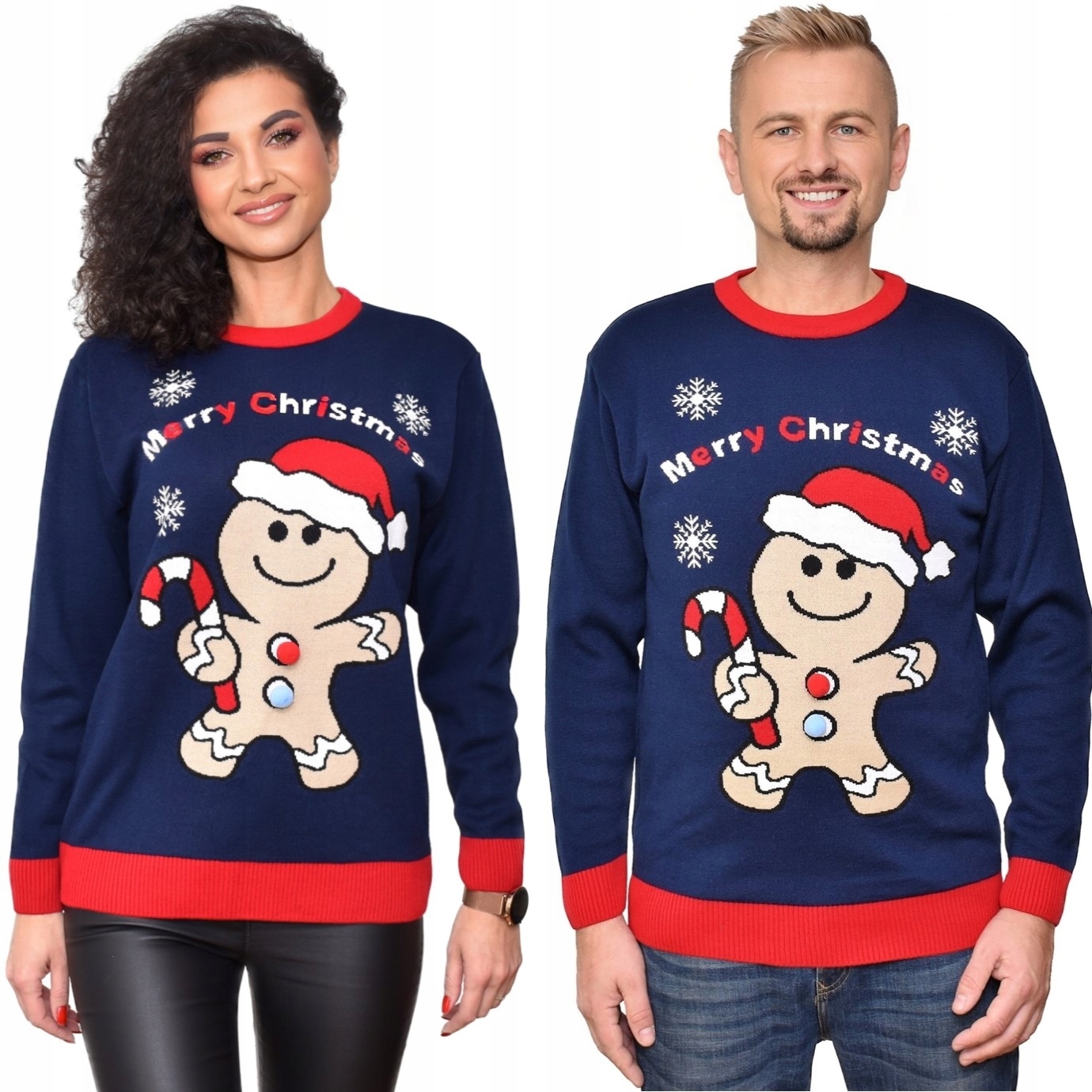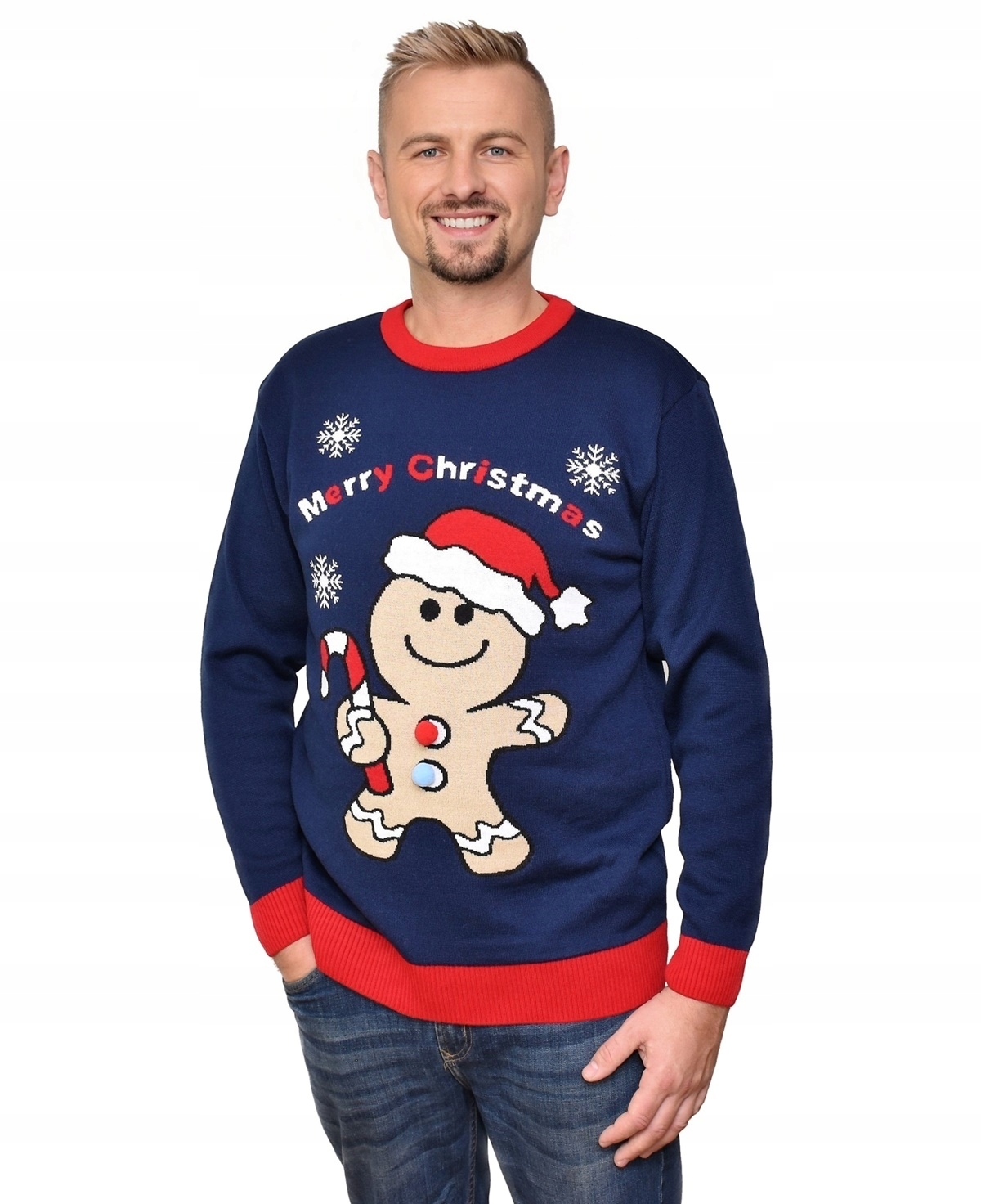Забавные рождественские свитера с изображением улыбающегося Пряничного человечка в шапке Санты. У мужчины красно-синий 3D помпон. На свитере надпись Merry Christmas.