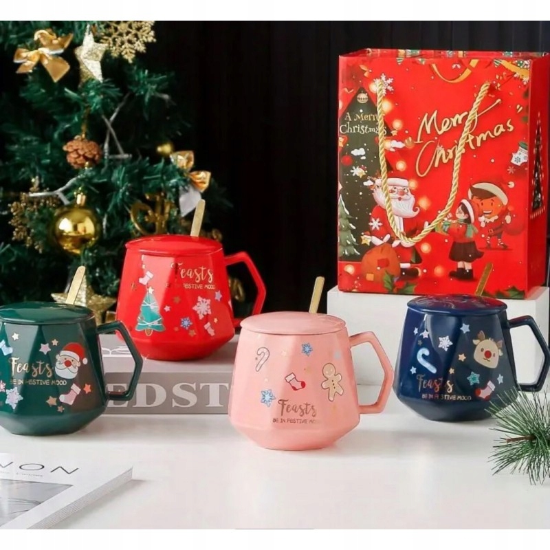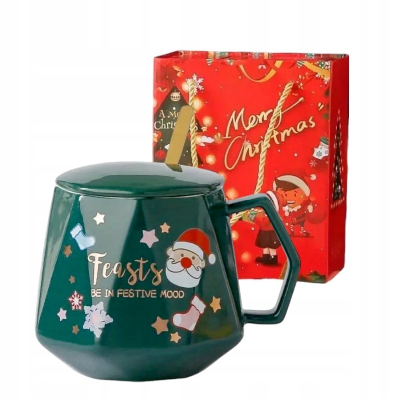 Керамическая чашка красная с рождественским мотивом. Установитесь с крышкой и ложкой, идеальным гаджетом для каждого любителя кофе или чая. Спецификация: Материал: Керамика / Острованая сталь Цвет: Зеленая емкость: максимум 440 мл Размеры: 9 см х 7,5 см. Набор, упакованный в декоративную картонную ящик Очистка: Продукт, предназначенный для ручной мытья упаковки.
