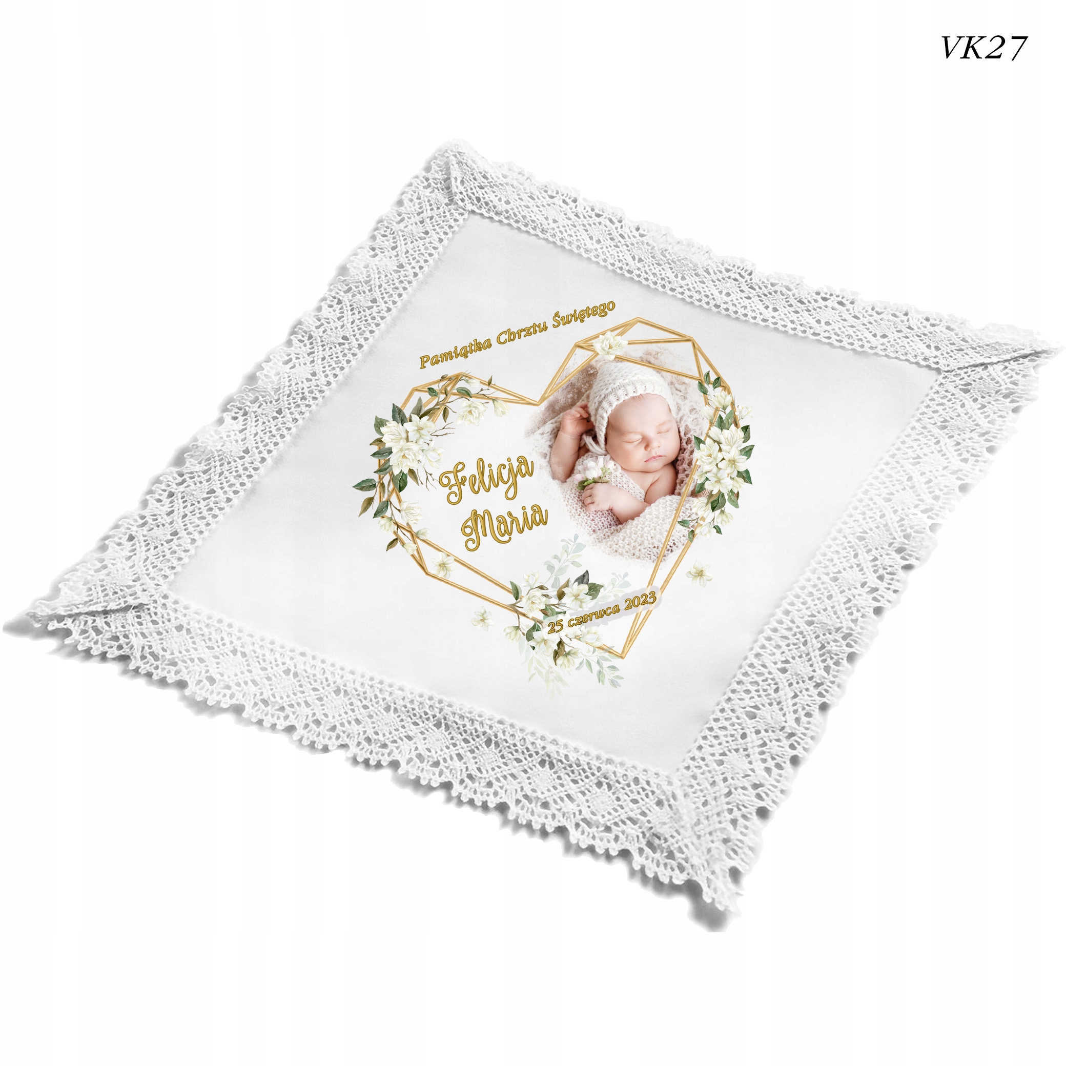 Крестильная мантия в виде носового платка – незаменимый аксессуар, который должен иметь Крестная мать. Красивый мотив из хлопковогокружева идеально сочетается с именем ребенка и датой на одежде.