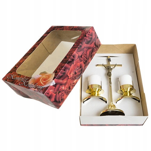 Набор колядок является важным элементом снаряжения во время пастырского визита в наш дом. Вышеуказанный комплект отличается современной формой. Крест и подсвечники золотого цвета, а изображение Иисуса - цвета старого золота.