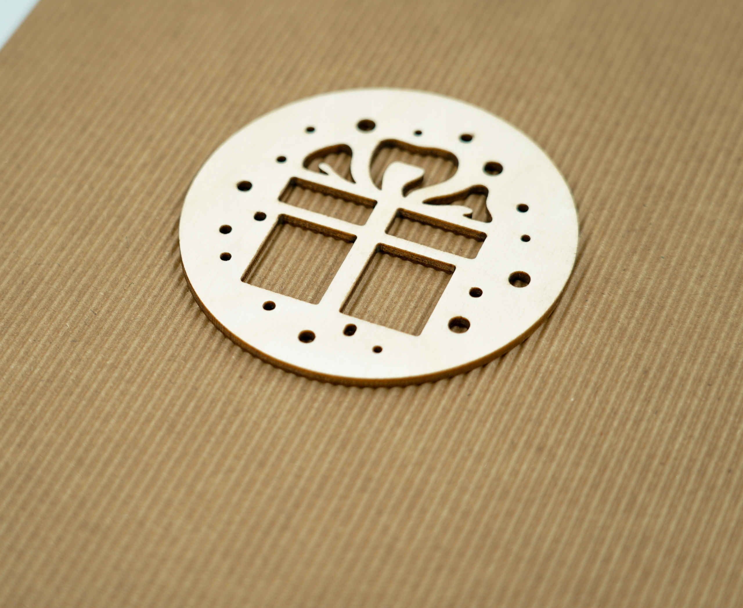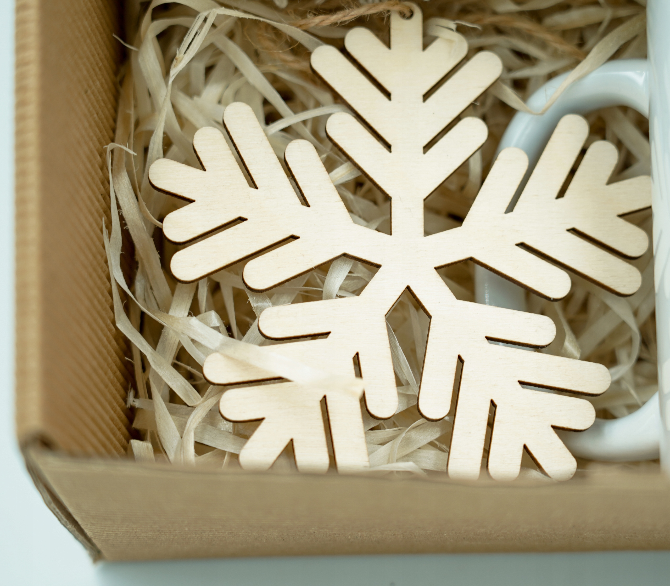 - Деревянная безделушка в форме снежинки и подставка под кружку с лазерной гравировкой прекрасно дополнит подарок.