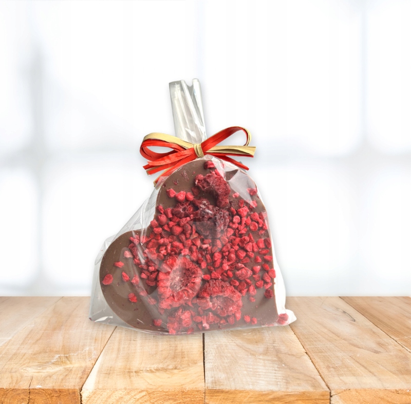 - Вкусный шоколад в форме сердца с сублимированными фруктами 40 г, упакованный в целлофан с бантом.