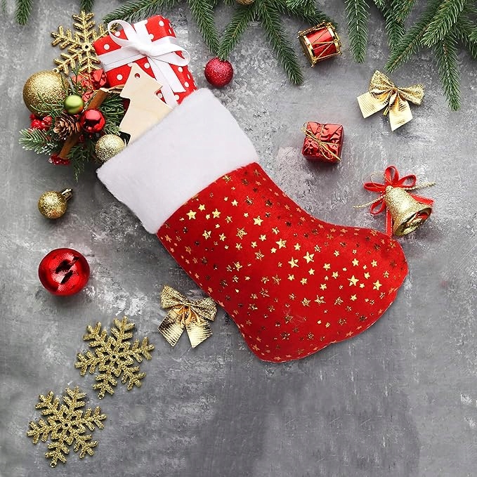 - Эти чулки из полиэстера мягкие и бархатистые на ощупь и отделаны белым искусственным мехом. Носки красные и украшены изящными звездочками из золотой фольги. Эти чулки будут выглядеть празднично и роскошно, если их повесить на мантию.