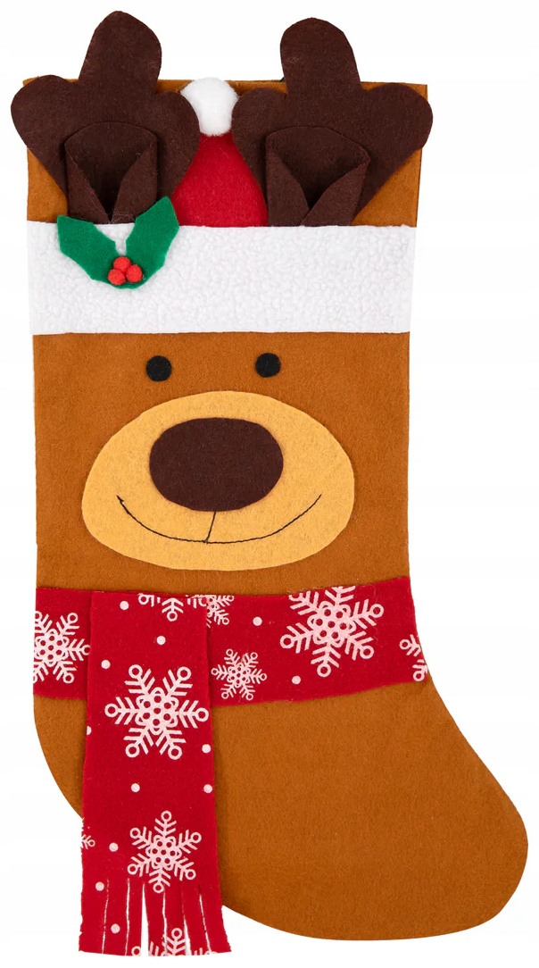 Симпатичный светло-коричневый подарочный носок с головой оленя в шарфе. Шапка украшена небольшой веточкой остролиста. Теперь вам остается только наполнить его подарками!