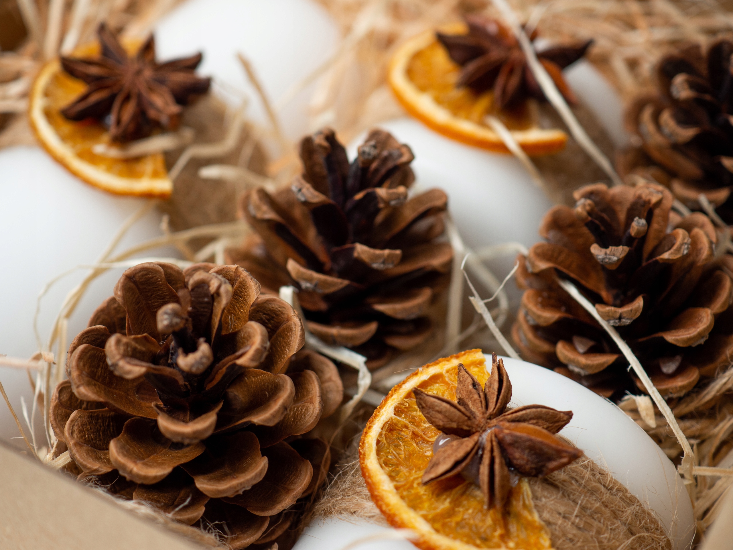 Свечи украшены сушеным апельсином и гвоздикой и джутовой веревкой. Они могут быть дополнением к подарку или готовым набором.