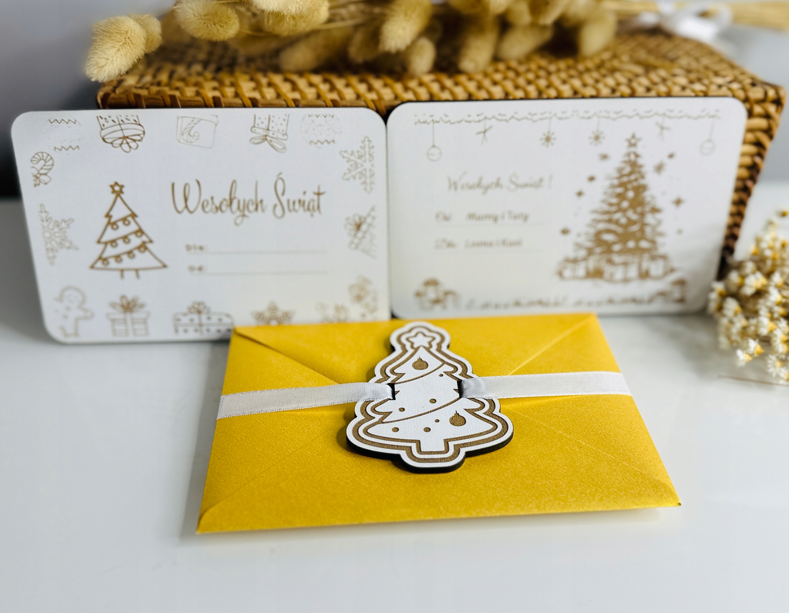 Наш Рождественский подарочный сертификат — это элегантный подарок, который порадует каждого. В комплект входит золотой конверт, перевязанный лентой, и деревянный кулон на елку, благодаря которому подарок готов к вручению.