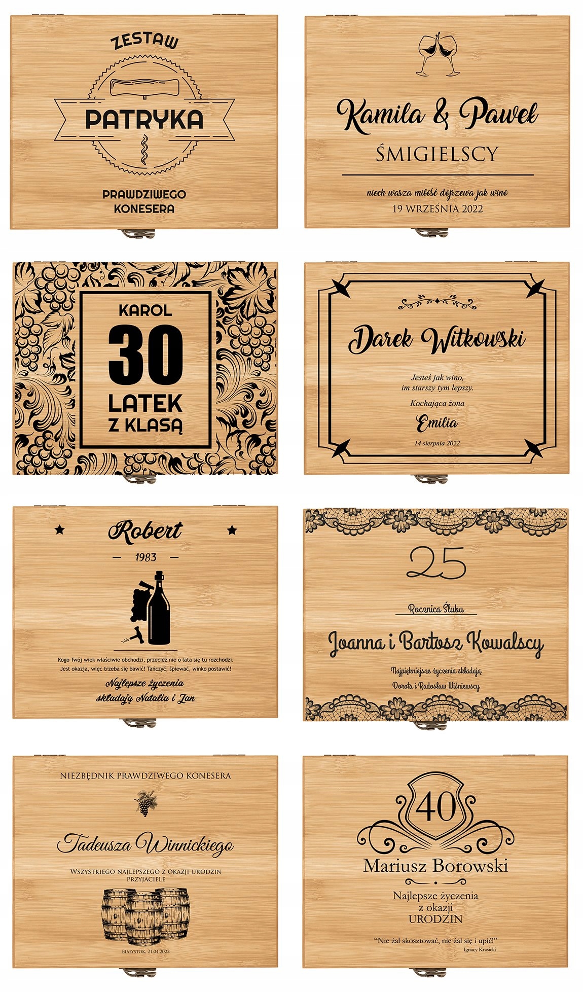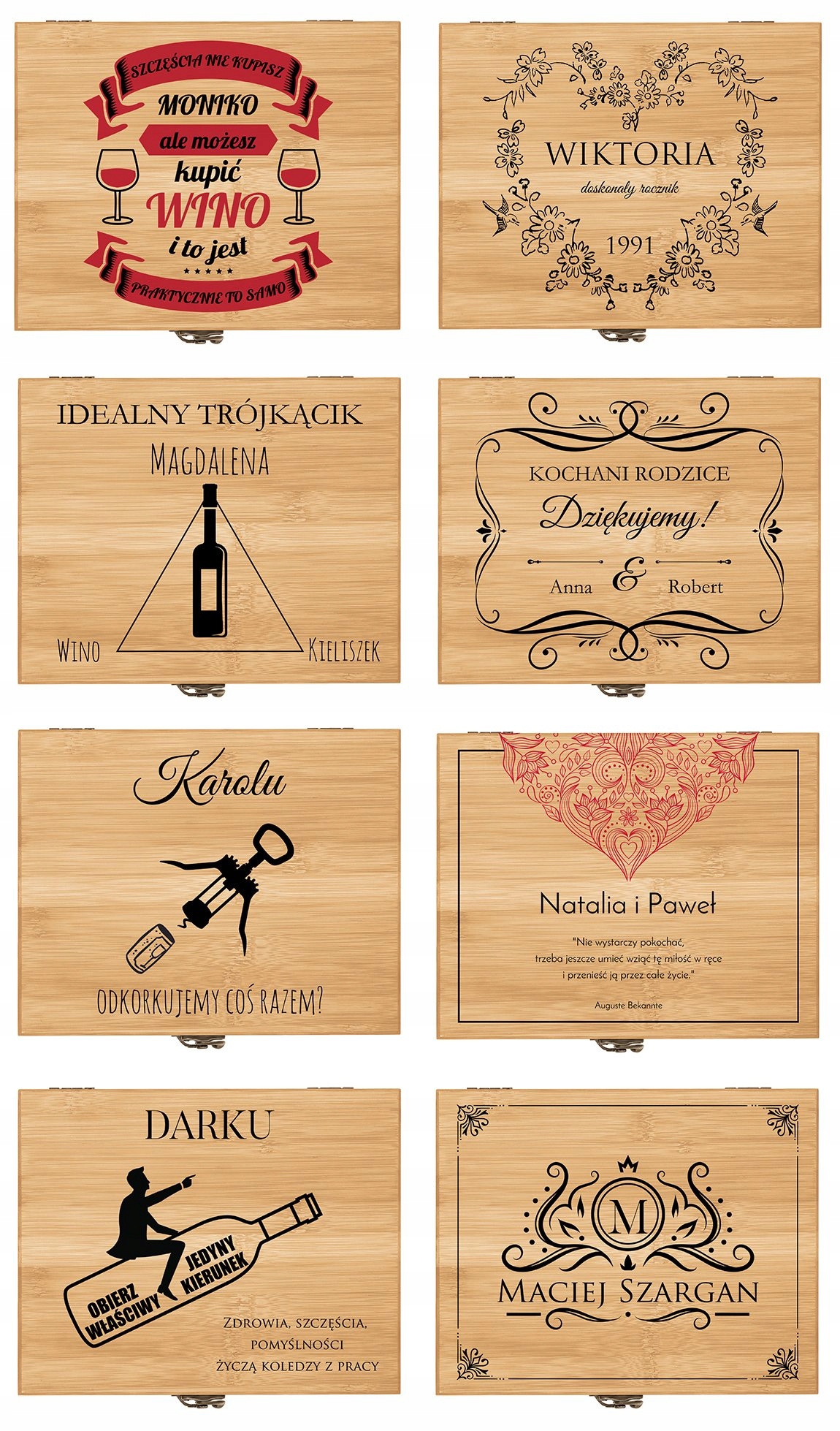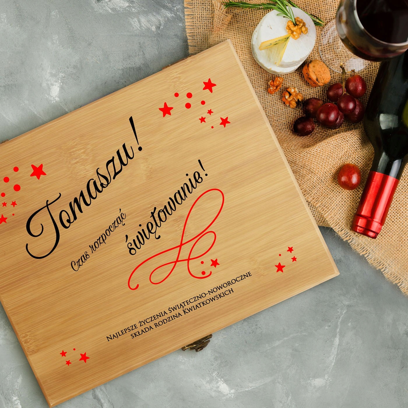 Ищете элегантный подарок, подходящий ценителю вина? Хорошая идея – это, конечно, бутылка любимого напитка. Однако чтобы подарок был интересным и функциональным, стоит дополнить его чем-то еще. Мы подготовили для вас идеальное дополнение к подарку – изысканную бамбуковую шкатулку с профессиональным набором винных аксессуаров. В комплект входят: открывалка для официанта, привлекательные пробки, термометр для измерения температуры вина и кольцо на горлышко бутылки, чтобы не капало. Элементы комплекта дополнительно декорированы бамбуковой отделкой. На крышке коробки мы напечатаем индивидуальное поздравление по вашему выбору. У вас есть возможность подарить любимому человеку что-то совершенно уникальное!
