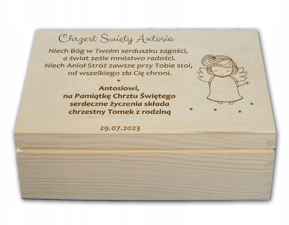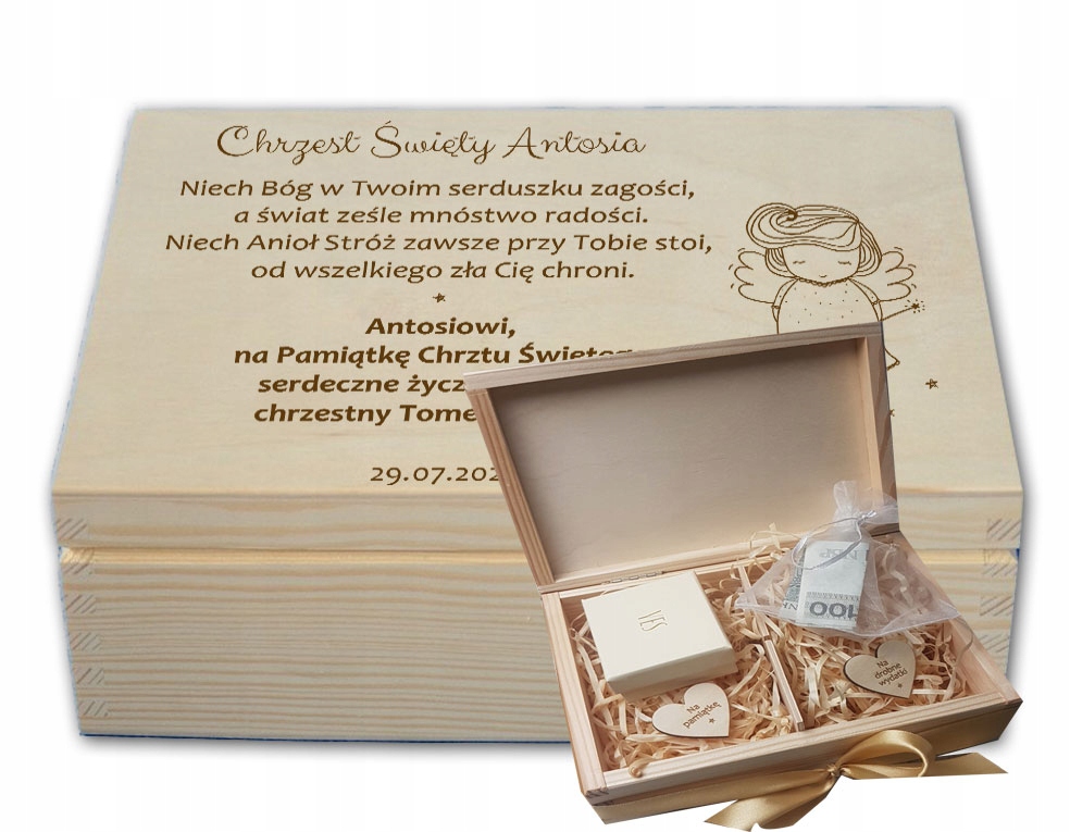Сверху гравировка пожеланий и подпись, внутри два отделения - для денег и еще один сувенир - ангелочек, цепочка, браслет, слоник.