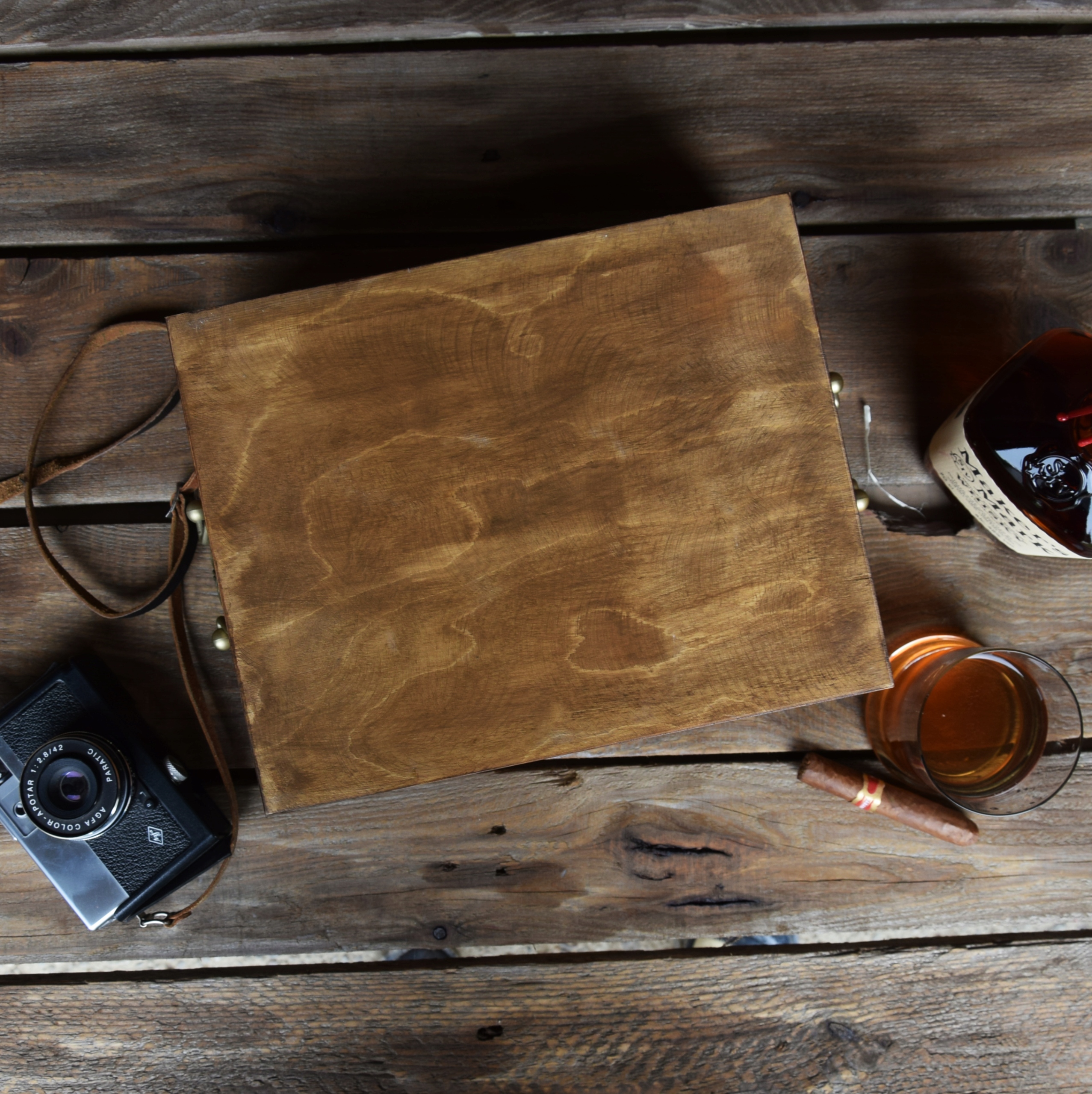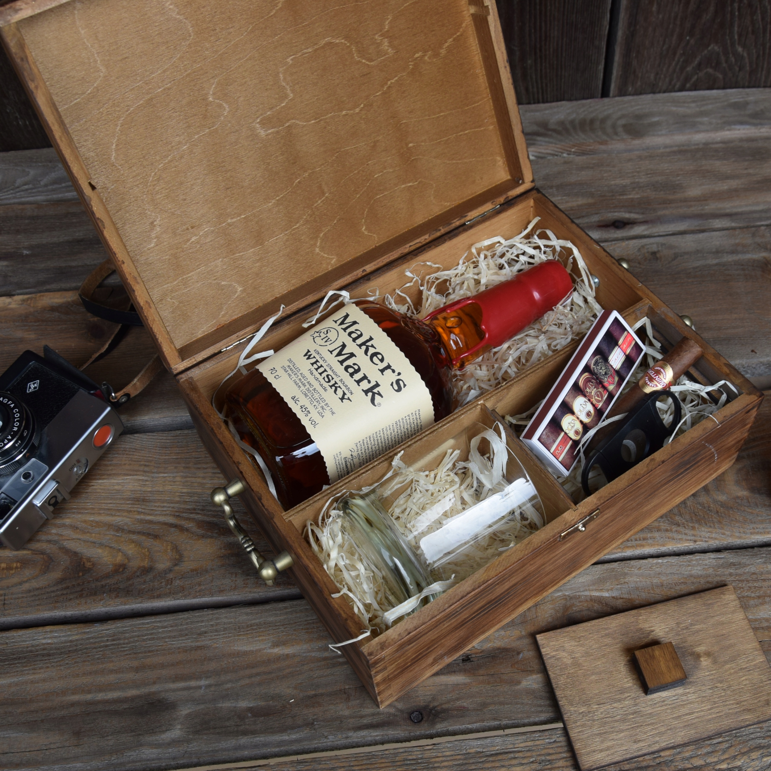 - деревянную шкатулку для любителя виски с закрытым карманом