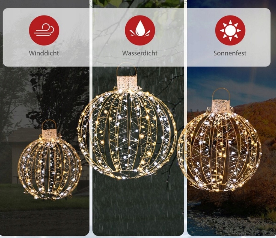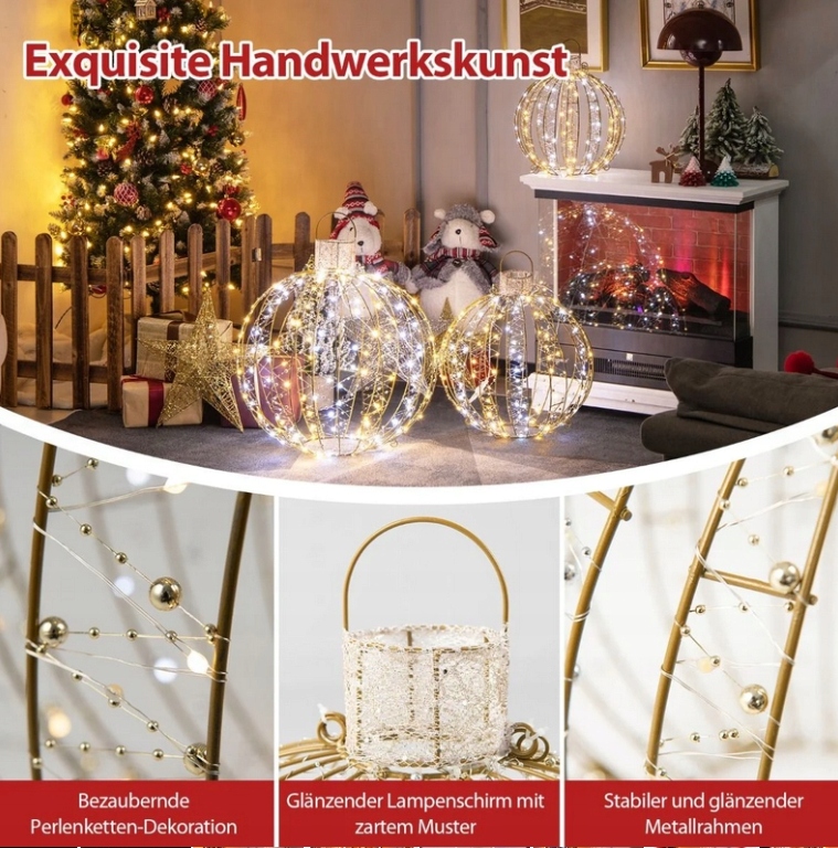 Содержит 3 разных размера, светлые шарики, пораженные тонкими струнами бусин. Вы можете объединить или организовать наши 3 рождественских светодиодных шариков по своему усмотрению, чтобы получить желаемый декоративный эффект. Его рама из нержавеющей железы не только сильная и долговечная, но и делает наши круглые светлые шарики более красивыми. Конечно, они также могут быть размещены прямо на полу в комнате. Благодаря степени защиты, IP44, безусловно, будет привлекательным украшением внутри или снаружи!