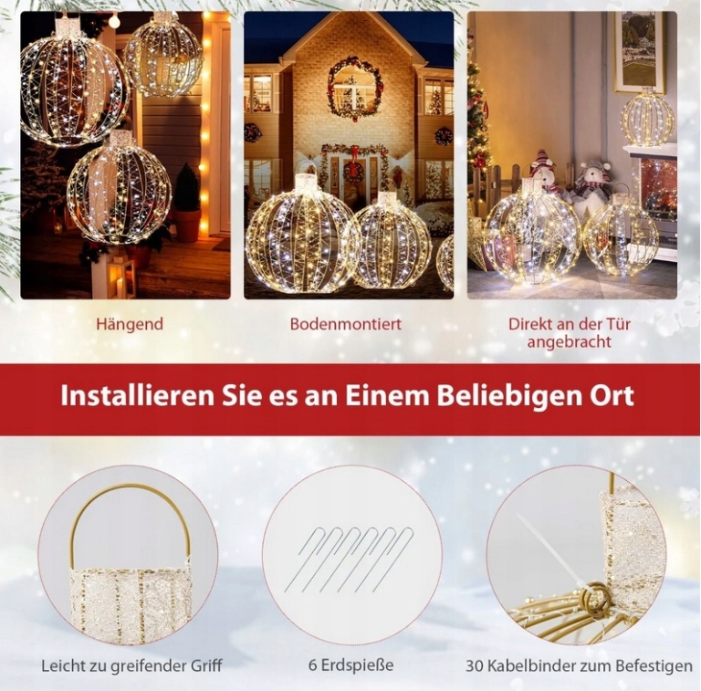 Много методов украшения: благодаря гениальному дизайну, наши легкие шарики позволяют вам выбрать предпочтительный способ использования в зависимости от ваших потребностей. Его можно положить в снег с помощью прикрепленных шипов в землю или повесить на дерево с удобной ручкой. Вы также можете поместить их прямо на пол комнаты.
