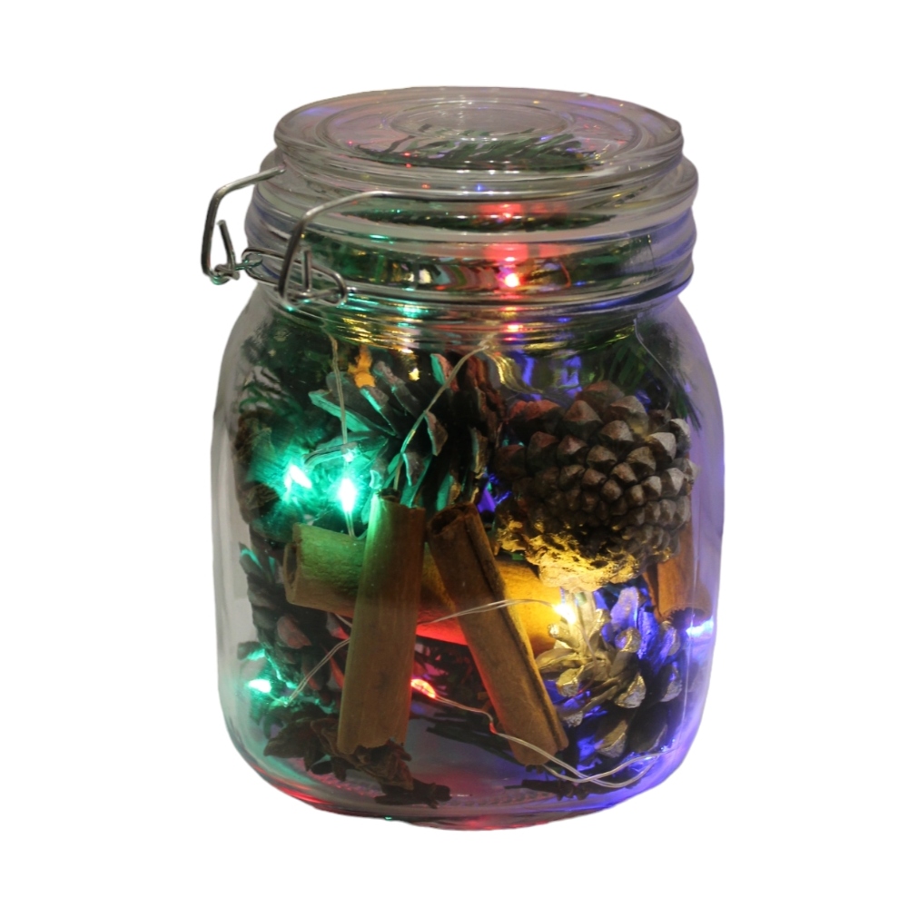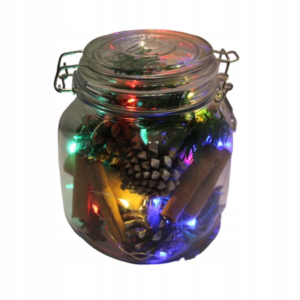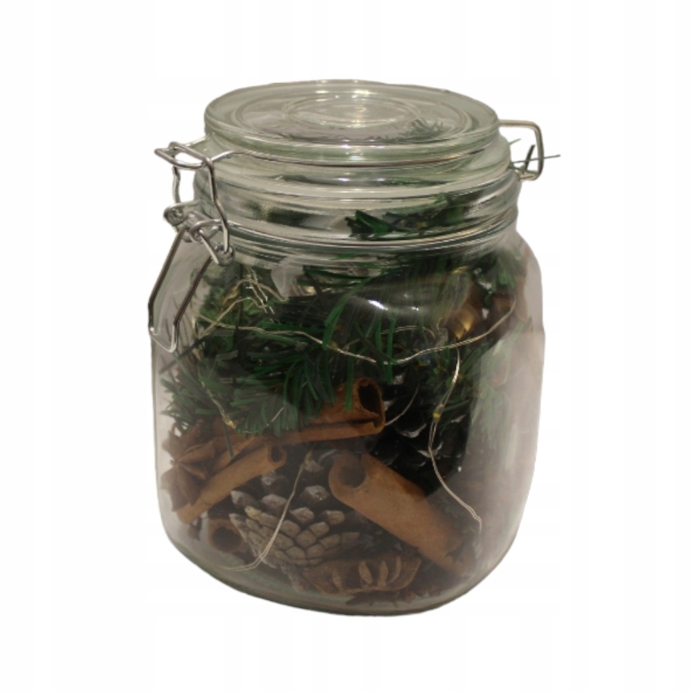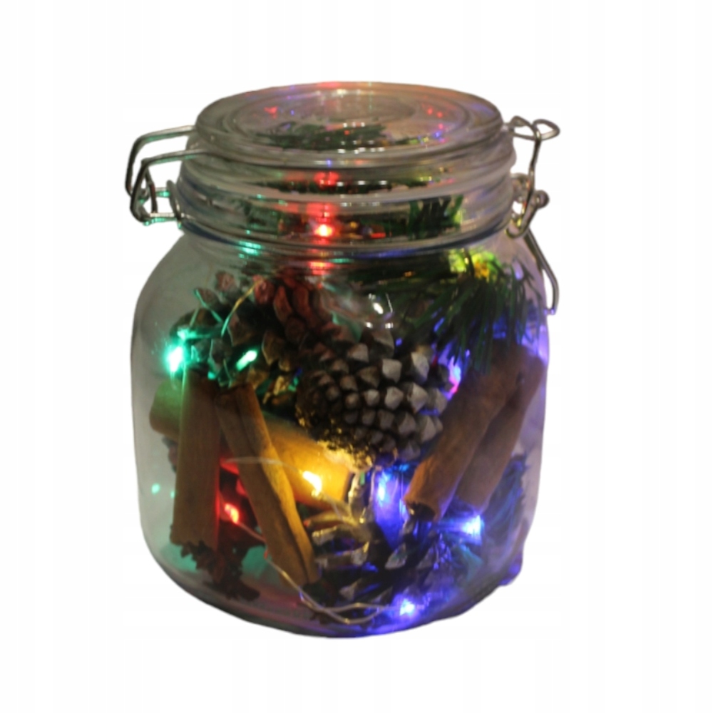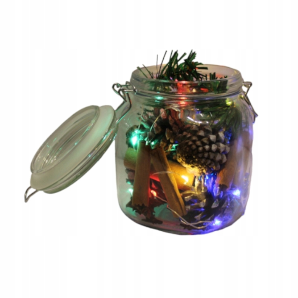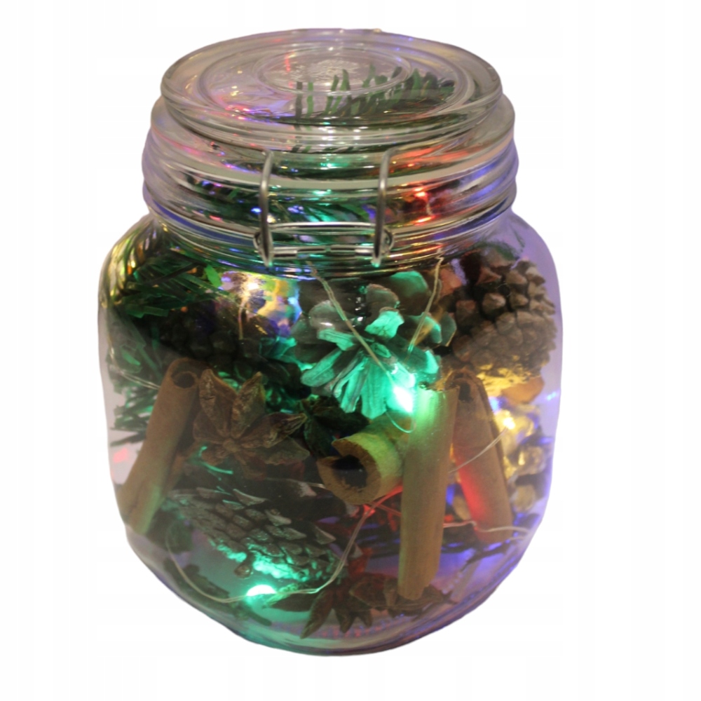 Представляем уникальное новогоднее украшение, в виде стеклянной банки с защелкой и металлической пряжкой. Это украшение, которое будет прекрасно смотреться как на новогоднем столе дома, так и на столе в офисе, а также на прилавке на ресепшене или в магазине. При этом украшение сохраняется уже после открытия крышки благодаря начинке, в состав которой входят, среди прочего: натуральные сушеные гвоздика, анис и корица, способные служить натуральным рождественским ароматом, привнося волшебство праздника в наши интерьеры. Кроме того, декоративная светодиодная цепочка придает украшению безупречное изящество и шарм, благодаря чему оно будет прекрасно смотреться даже в темное время суток.