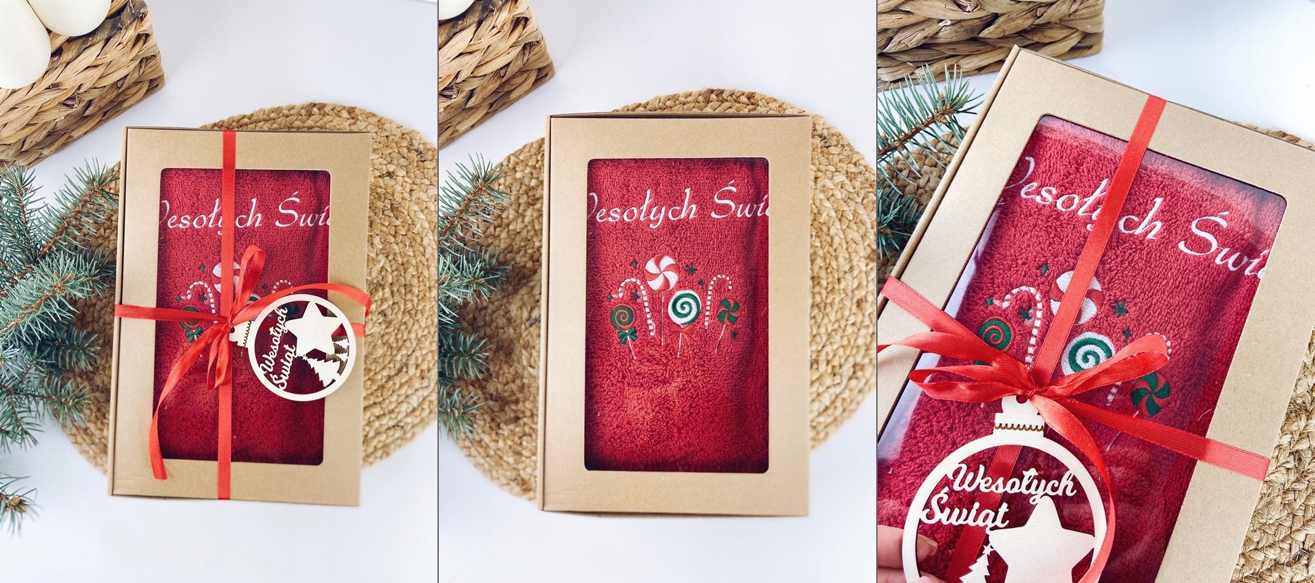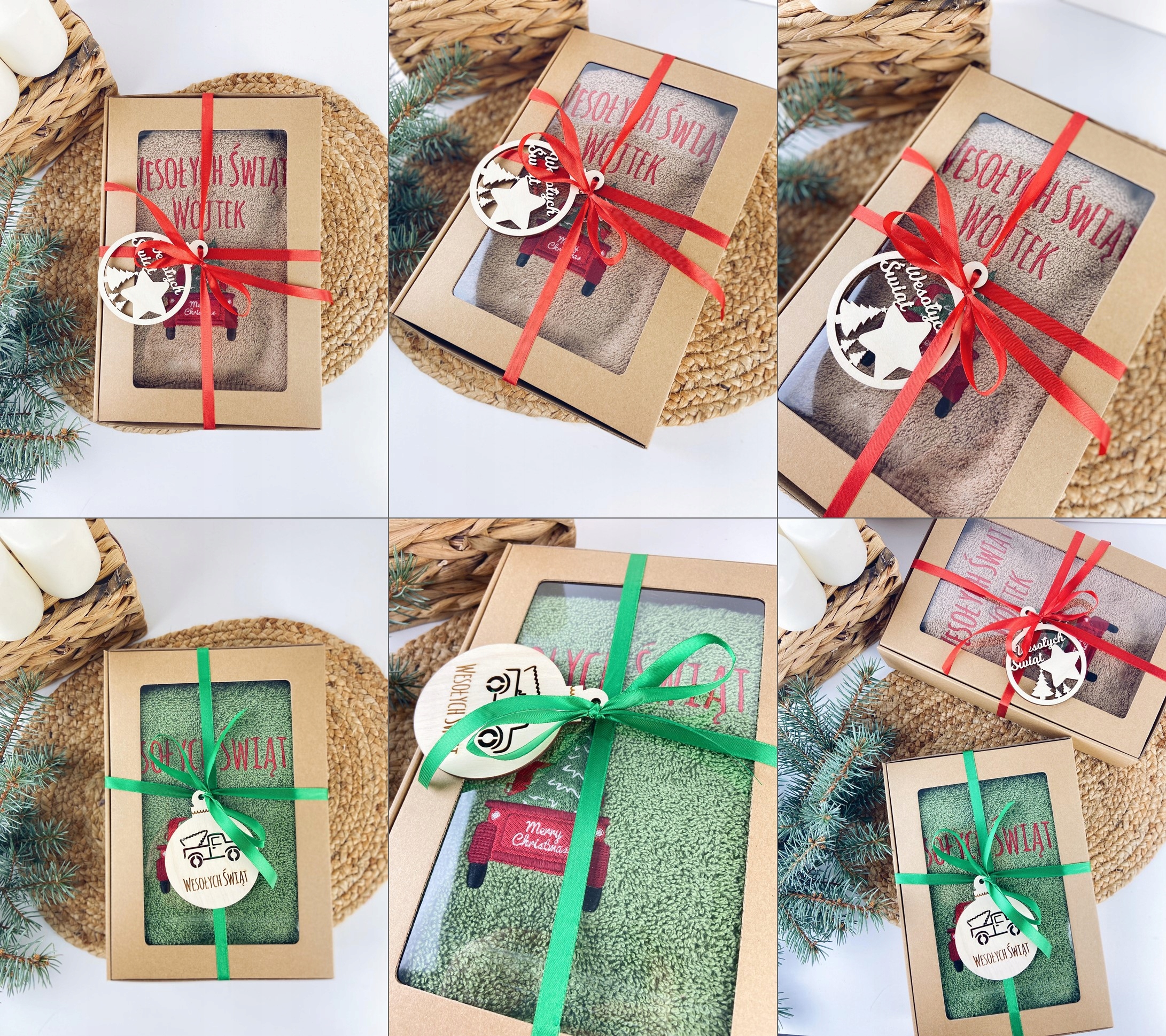 Полотенце упаковано в оконную коробку, перевязанную лентой и рождественской безделушкой.