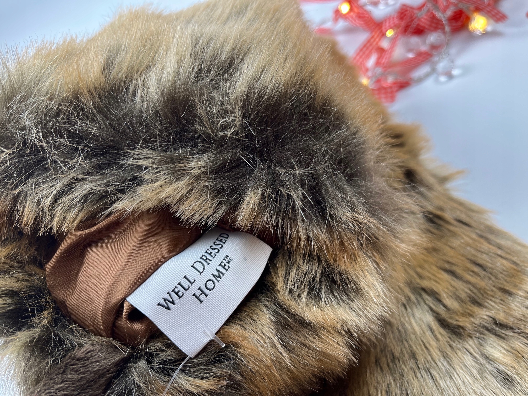 - Рождественский носок хорошо одетого дома бренда. Это меховой носок в коричневых черных цветах для подарков. Носок большой. У него есть петля, чтобы повесить его в выбранном месте, например, на камине. Это не гибкое, это отличное предложение как дополнение к рождественскому декору.