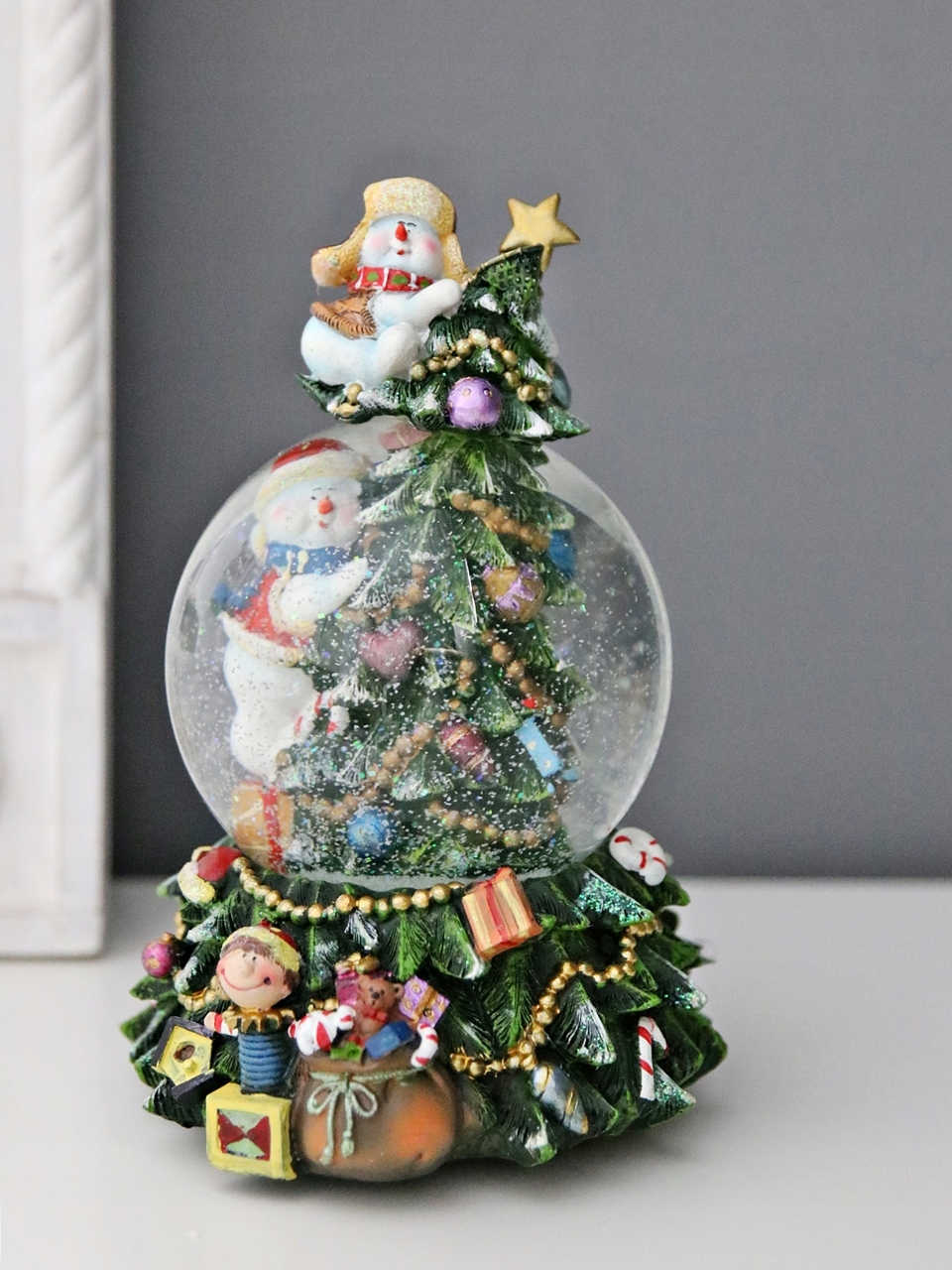 Внутри шара плавают мелкие частицы блесток, имитирующие падающий снег — нужно лишь слегка наклонить его. шар.