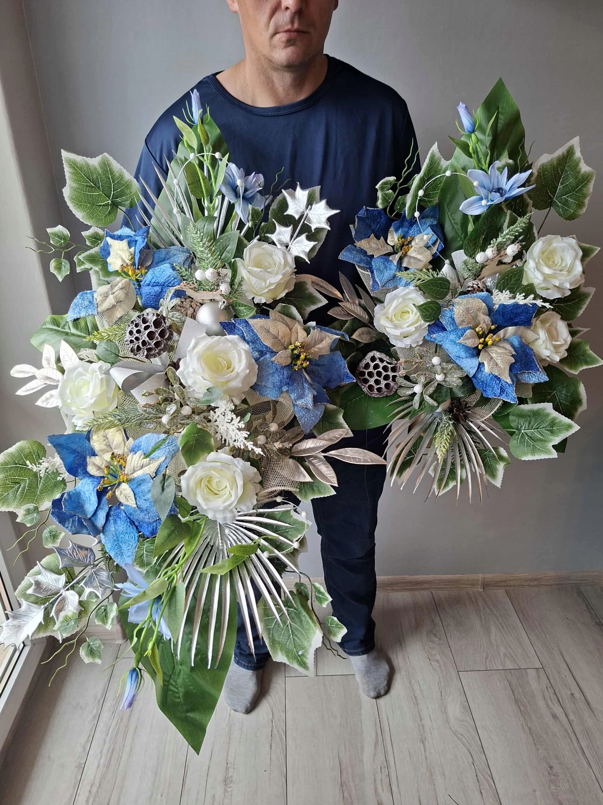 Украшения характеризуются уникальной композицией из искусственных цветов. Тщательно подобранные цветы чрезвычайно реалистичны, добавляют букету аутентичности и подчеркивают его торжественный характер. Это изделие идеально подходит в качестве элемента украшения могилы, сочетая в себе уважение и элегантность в одном тщательно продуманном дизайне.