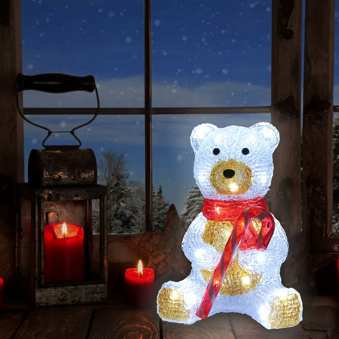 Этот стоячий акриловый светодиодный плюшевый мишка ярко сияет благодаря холодным белым светодиодам. Питание осуществляется от 5-метрового кабеля с адаптером IP44.