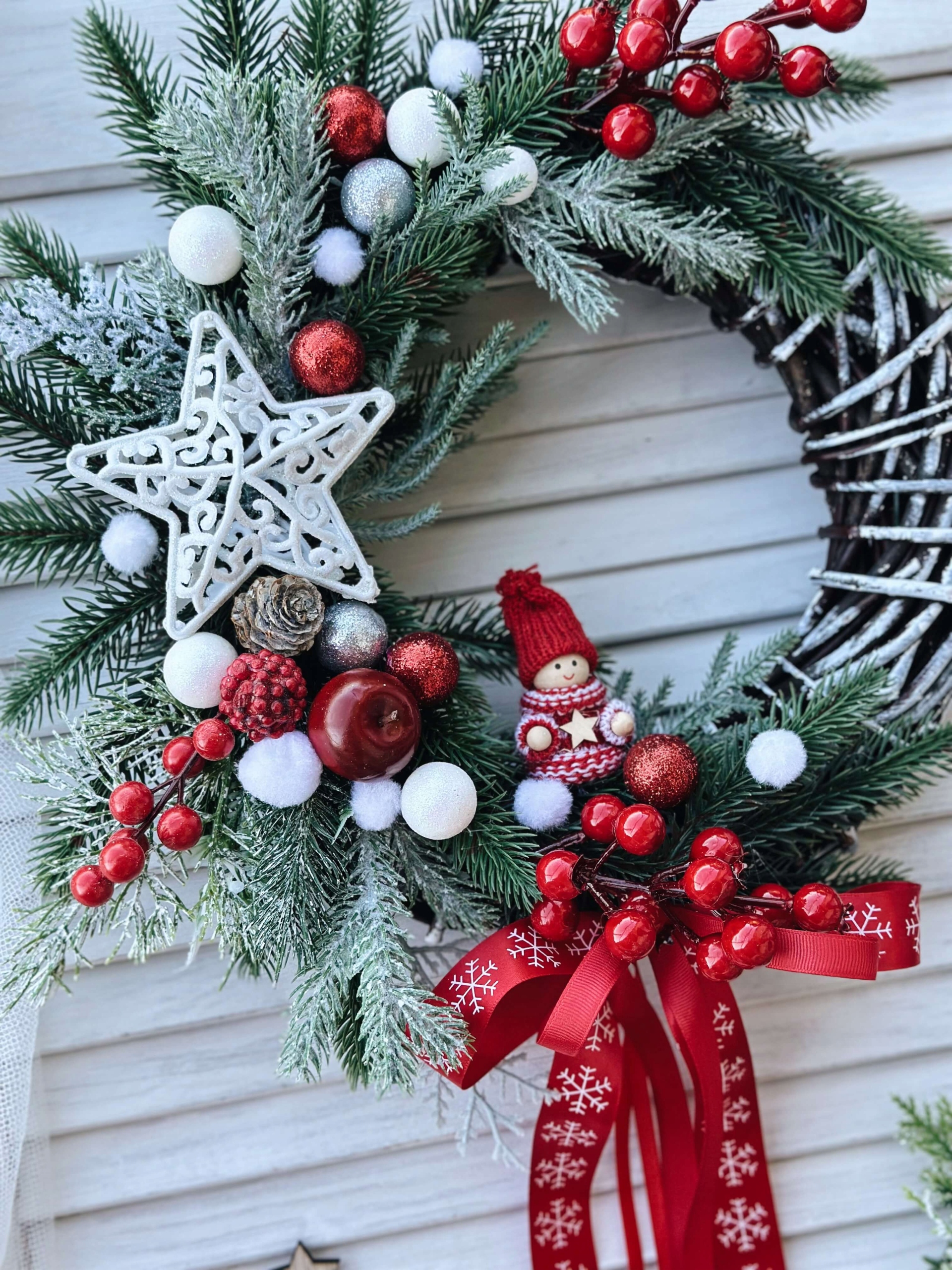 Праздничный венок, украшенный искусственными веточками, безделушками, рождественским парнем, эльфом и луком.
