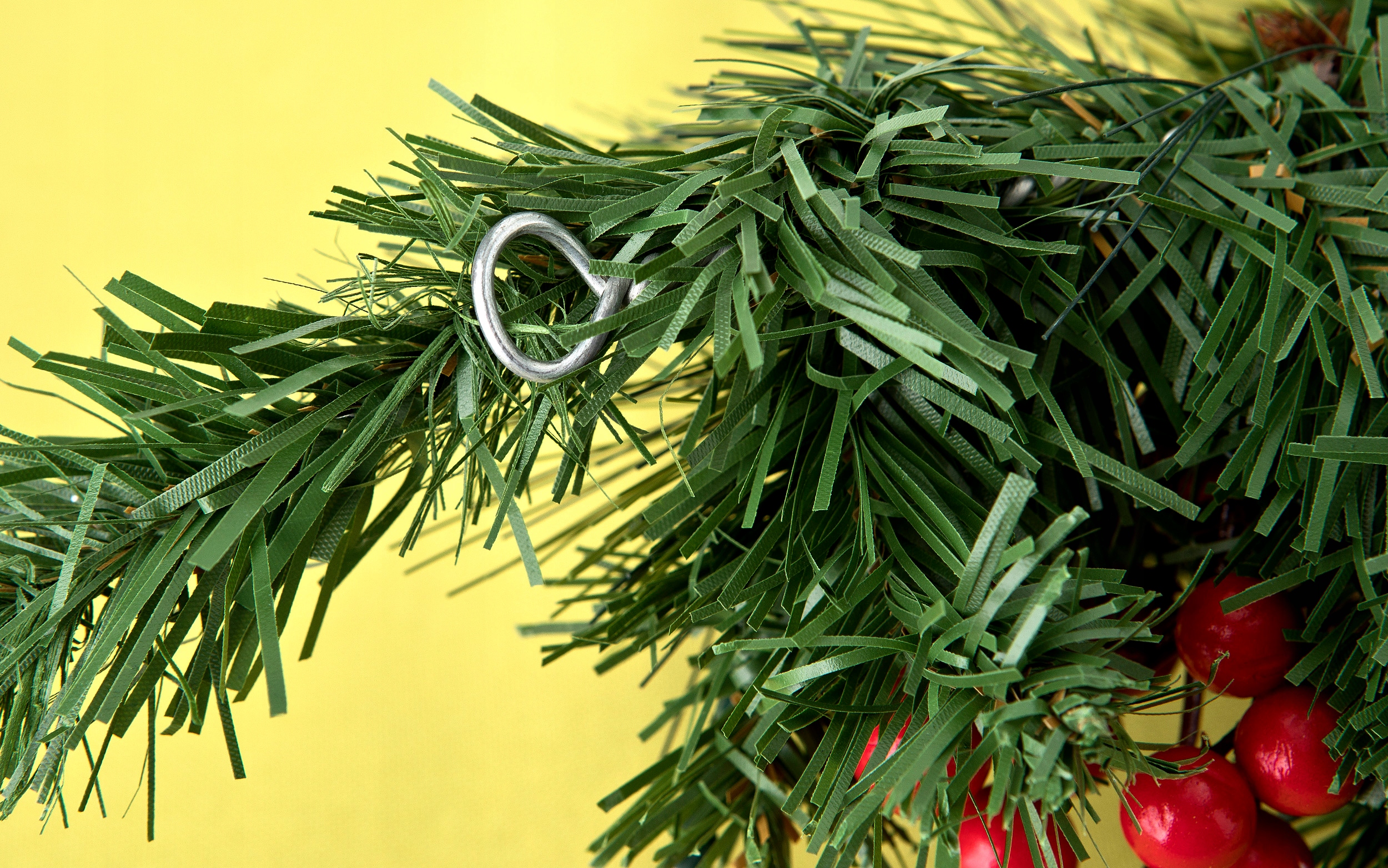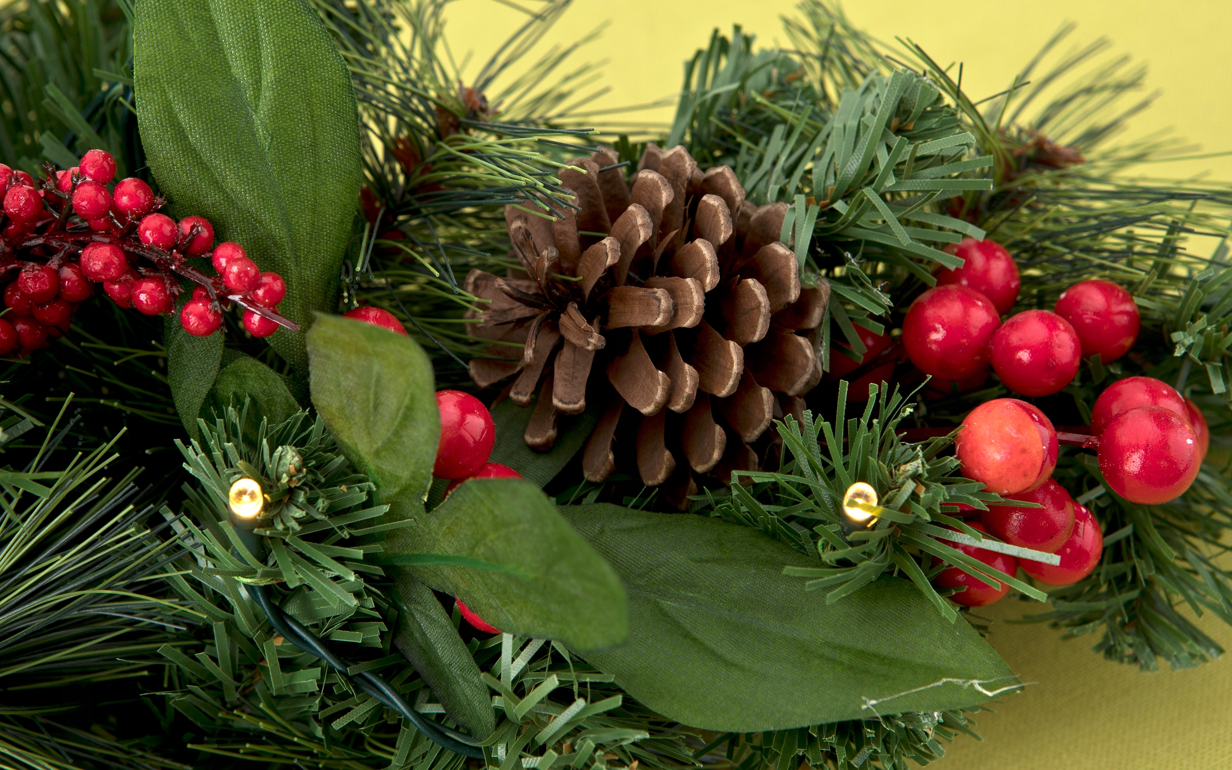 Среди хвои зеленые листья, маленькие красные шарики и декоративные шишки .