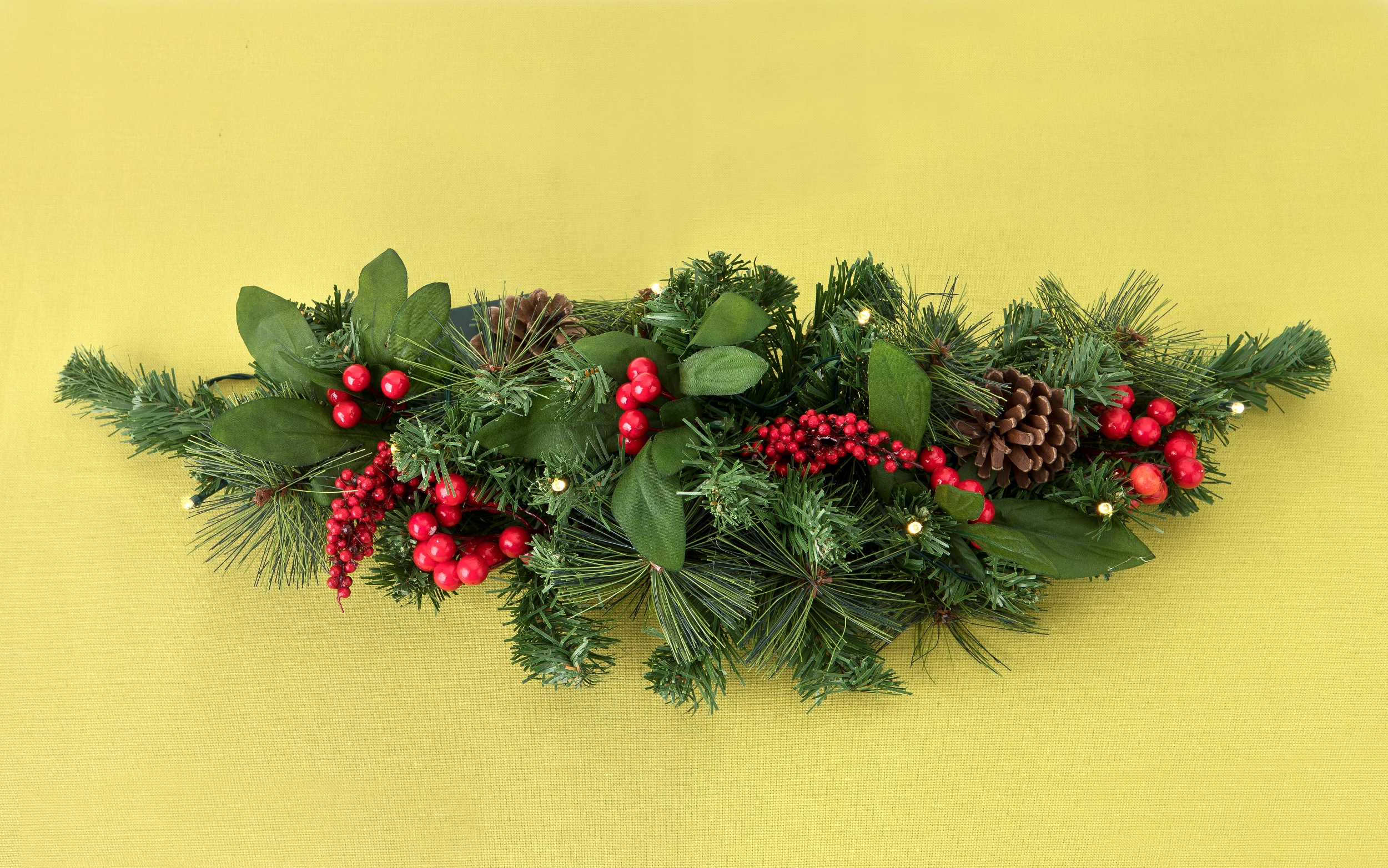 Комплектация: шишки, листья, красные веточки, светодиодные фонари.