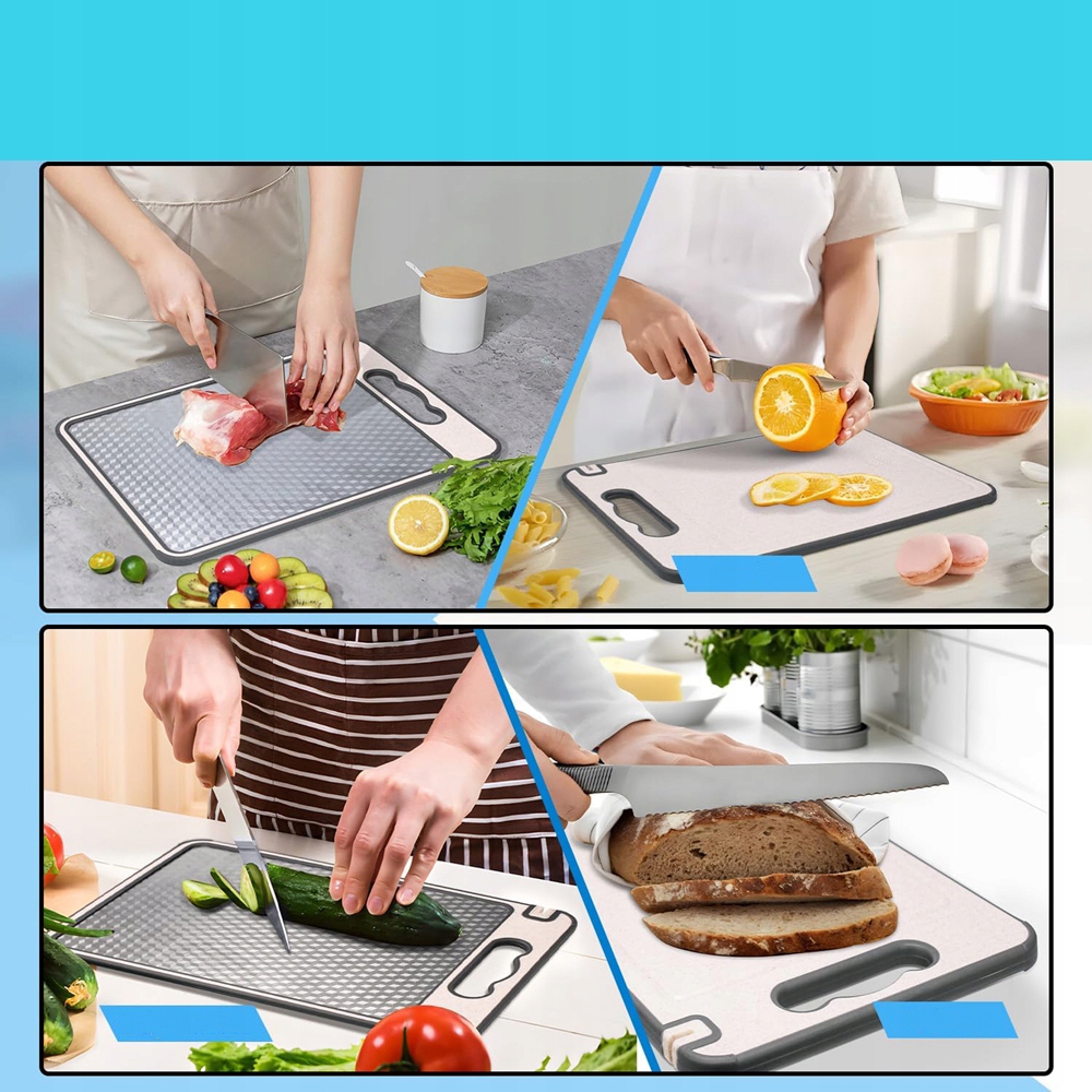 ⭐【Двусторонняя разделочная доска】Разделочная доска имеет двустороннюю конструкцию из нержавеющей стали 304 и полипропиленовой соломки. Нержавеющая сталь используется для нарезки сырого и приготовленного мяса, а пшеничная солома из полипропилена используется для нарезки овощей, фруктов, пиццы и хлеба, что эффективно предотвращает смешивание вкусов ингредиентов и повышает эффективность обработки кухонных ингредиентов.