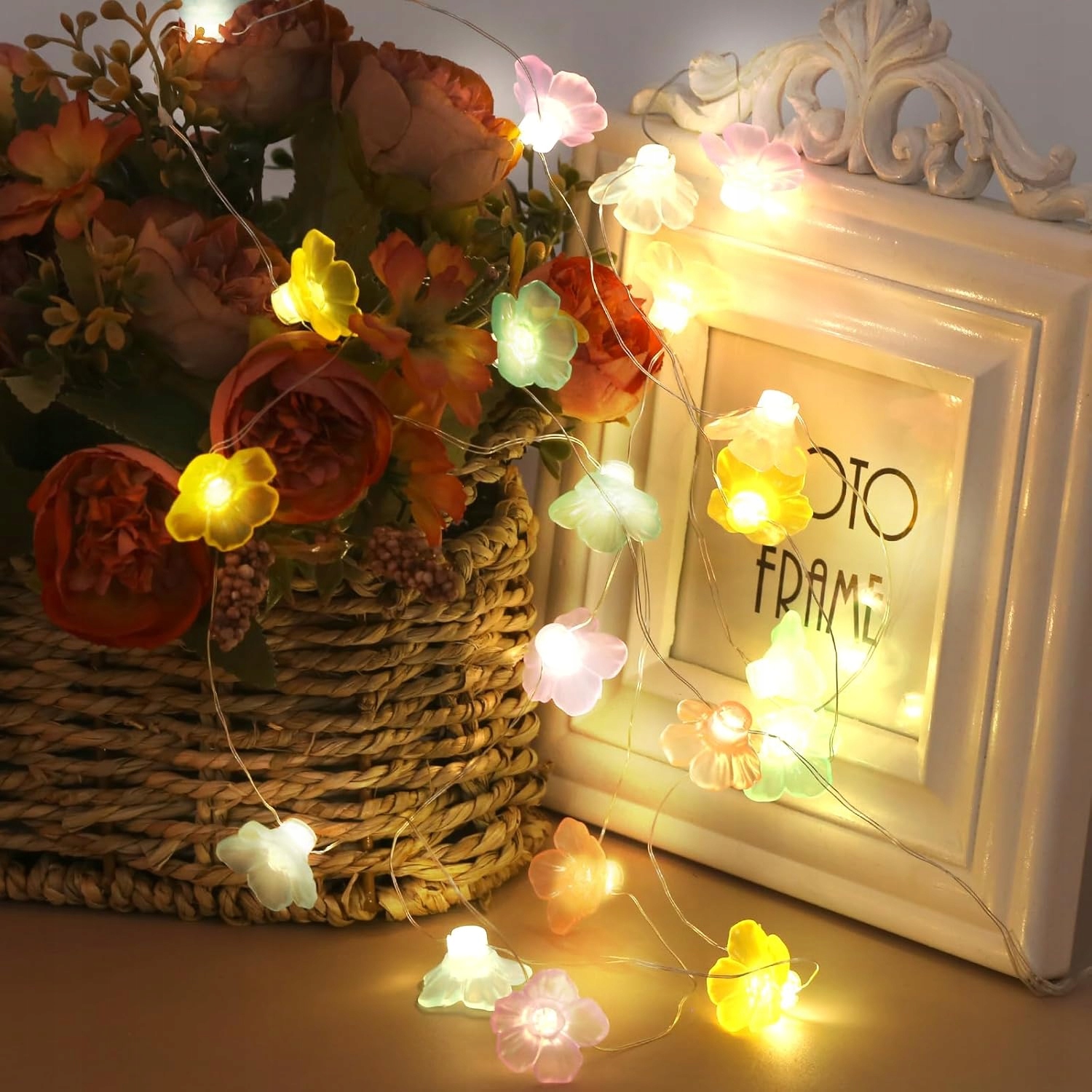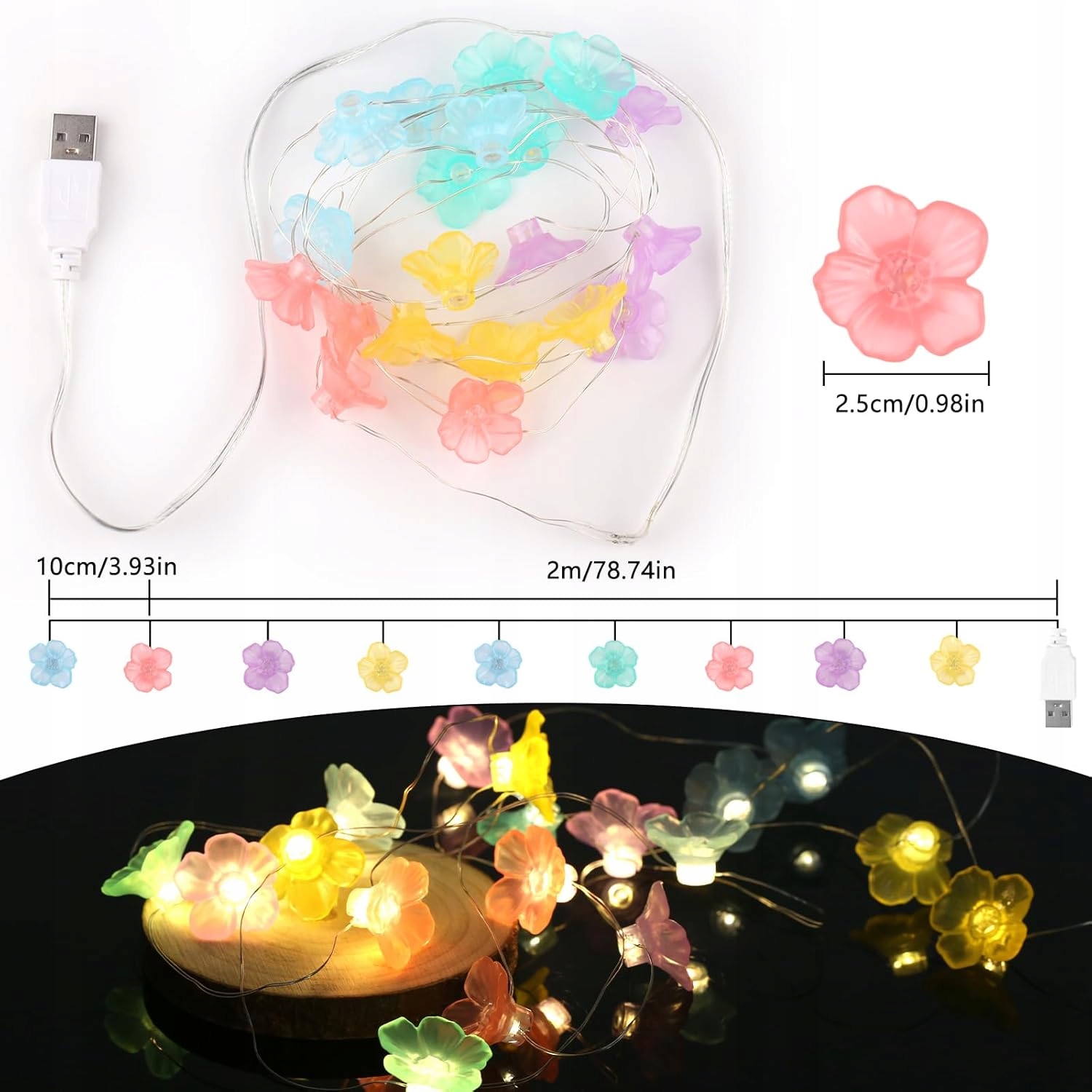 - 【Широкий спектр применения】: Эту цветочную гирлянду можно использовать в различных местах, таких как спальни, гостиные, обеденные столы, внутренние и открытые пространства, сады, горшечные растения и т. д., создавая романтическую и мечтательную атмосферу. Цепочка огней также станет отличным подарком друзьям и близким на Рождество, карнавал, дни рождения и другие особые случаи.
