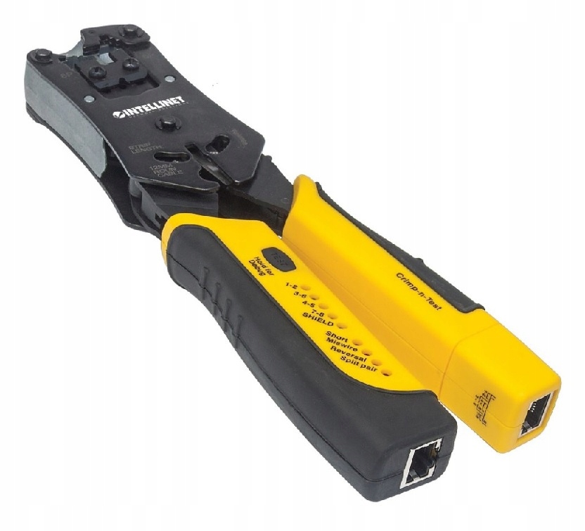 Модульный обжимной инструмент для вилок Intellinet 780124 с кабельным тестером — универсальный модульный инструмент для обжима вилок, снятия изоляции, резки кабелей и, наконец, проверки готовых сетевых кабелей на целостность соединения. , короткое замыкание, перепутывание проводов и неправильное соединение пар. Модульный обжимной инструмент для вилок Intellinet 780124 с тестером кабелей — идеальный инструмент для каждого сетевого установщика, который ценит профессионализм, а также скорость и удобство работы.