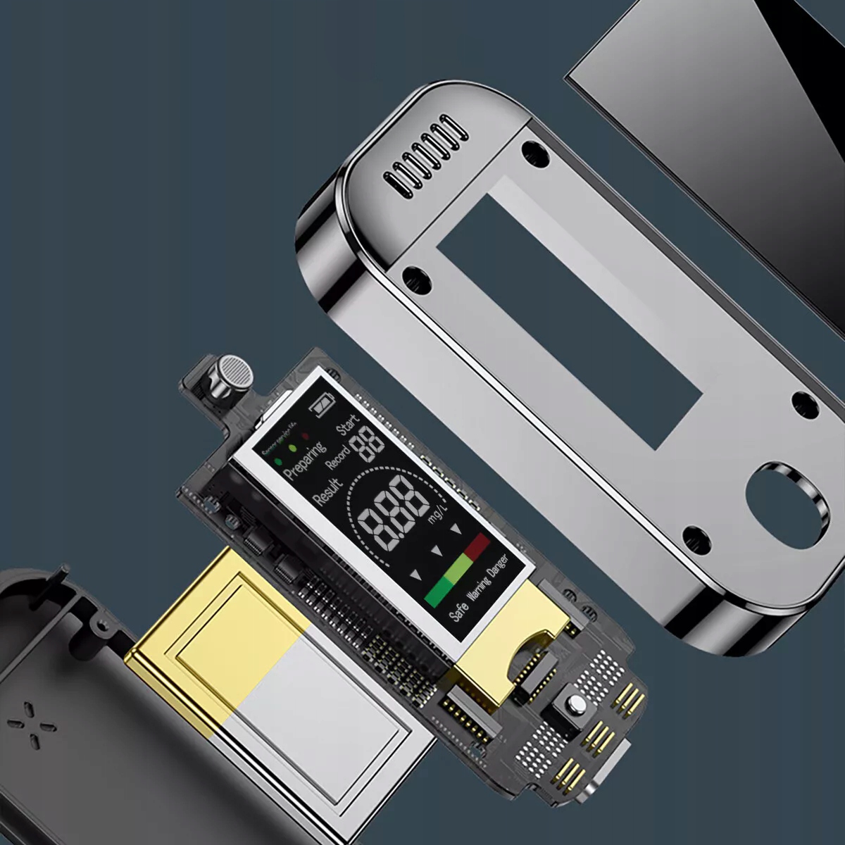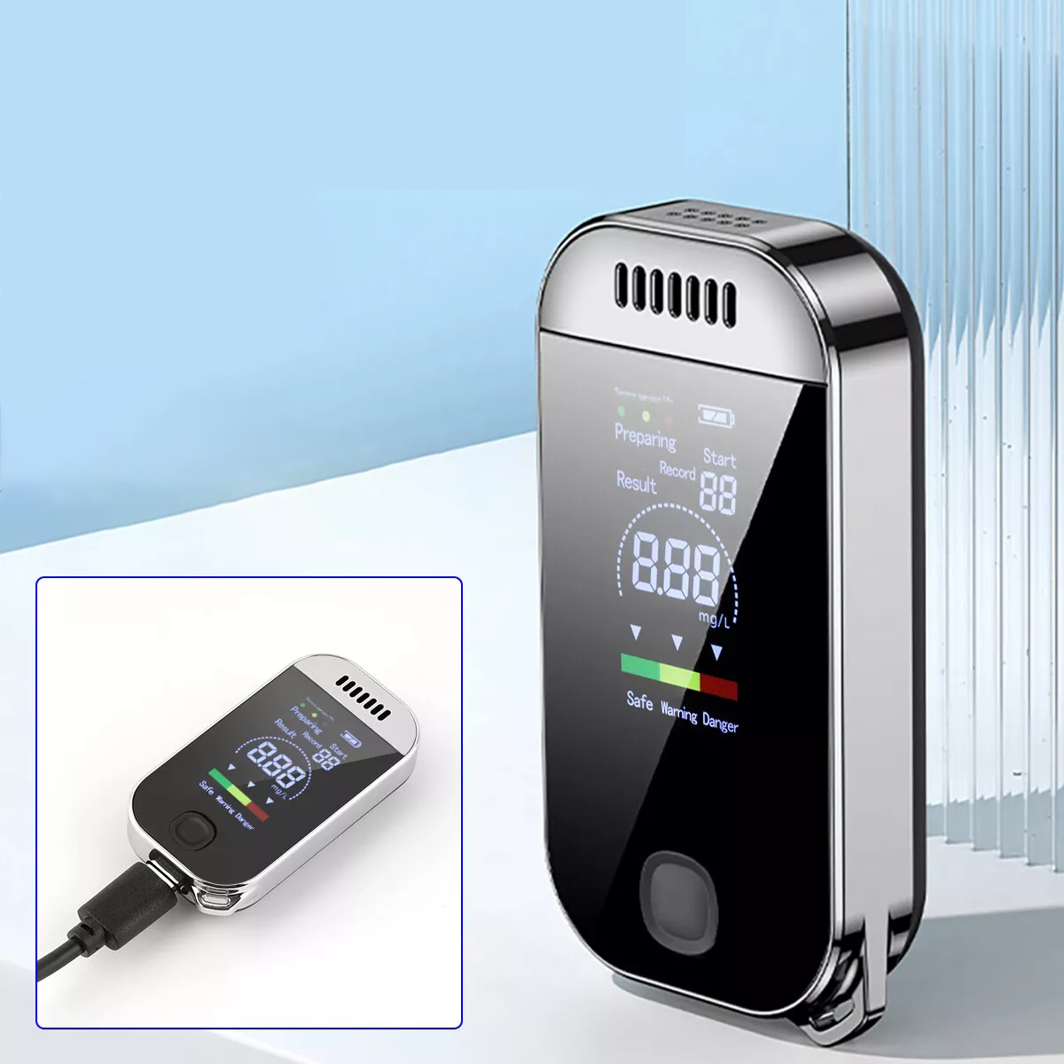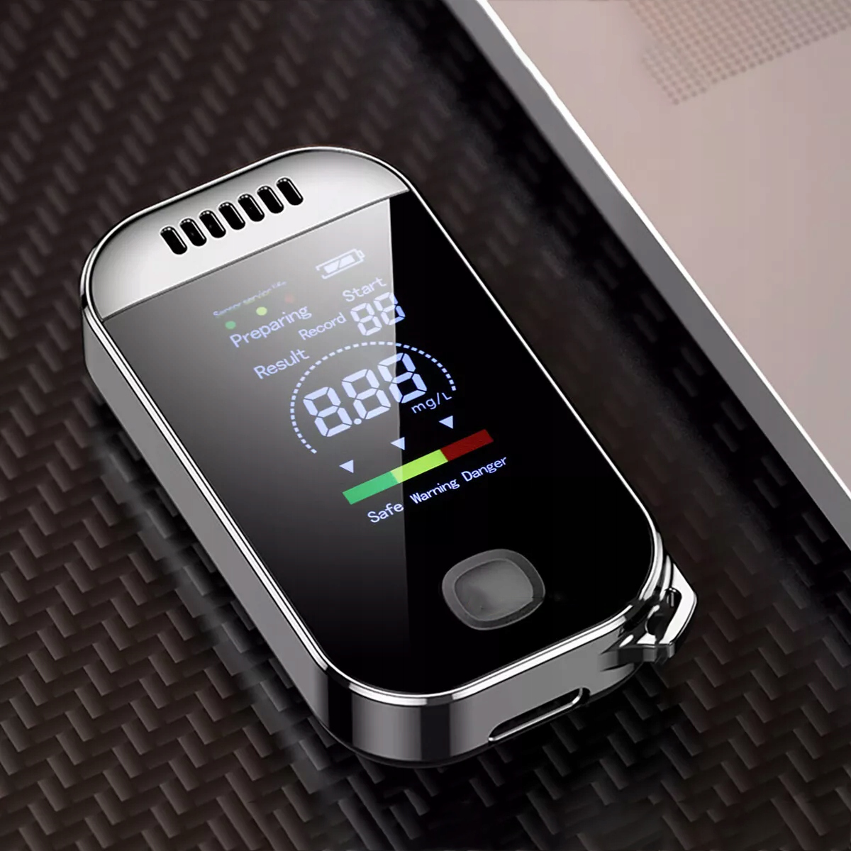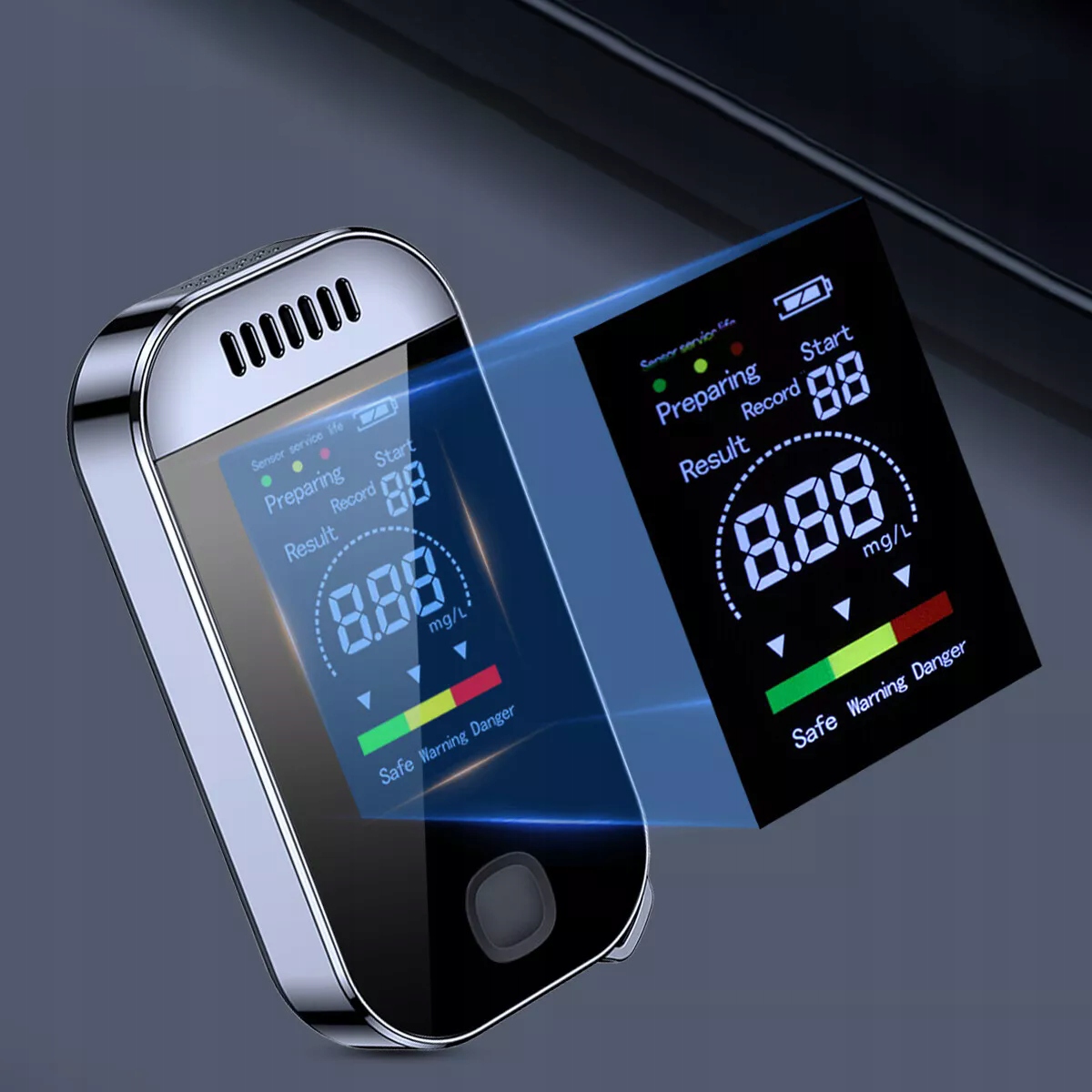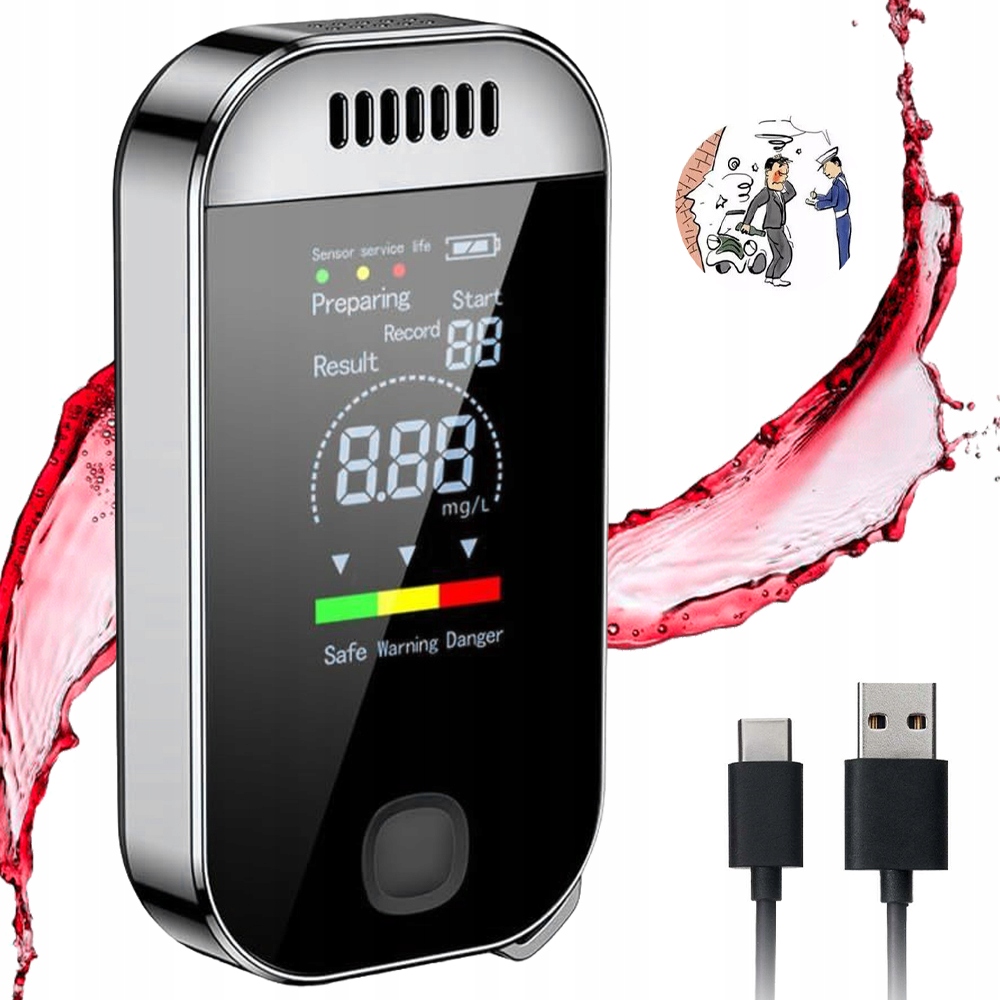- оснащен цифровым ЖК-дисплеем с высоким разрешением, отображает состояние употребления алкоголя в трех цветах, что позволяет немедленно предварительно просмотр содержания алкоголя.