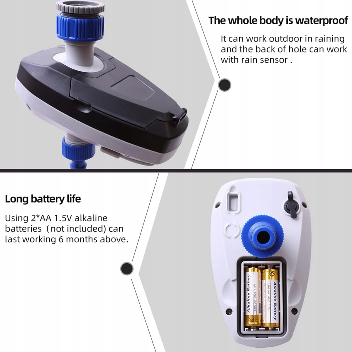 - Большой ЖК -дисплей показывает детали настройки и индикатора низкого уровня батареи. Обновленная версия позволяет подключить таймер орошения к датчику дождя (датчик дождя не включен)