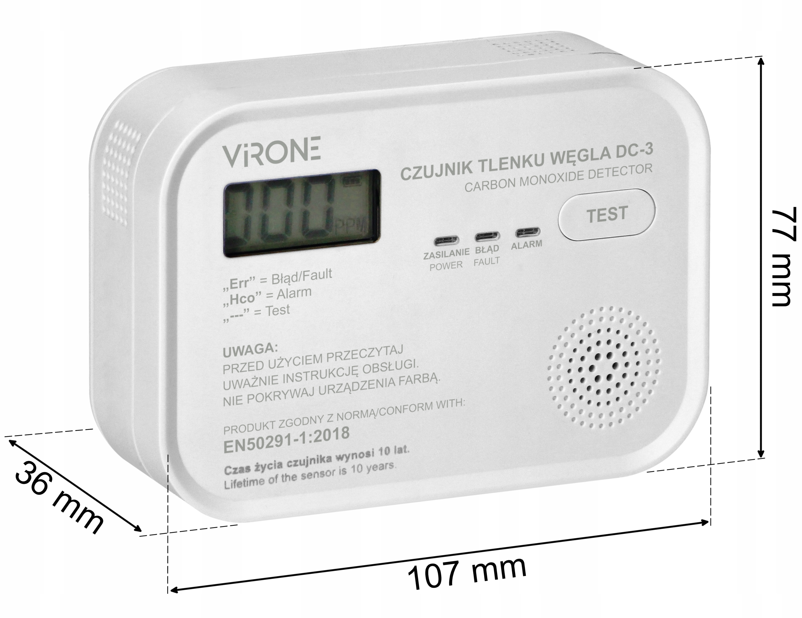 Детектор угарного газа VIRONE DC-3 соответствует строгому стандарту EN 50291 -1: 2018 г. для бытовых детекторов угарного газа.