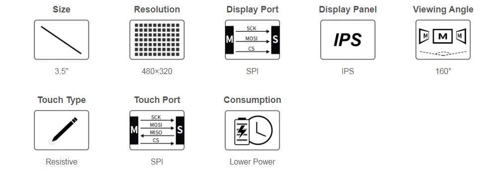 3,5-дюймовый резистивный сенсорный экран с разрешением 320 x 480 пикселей с матрицей IPS. Работает с Raspberry Pi через разъем GPIO.