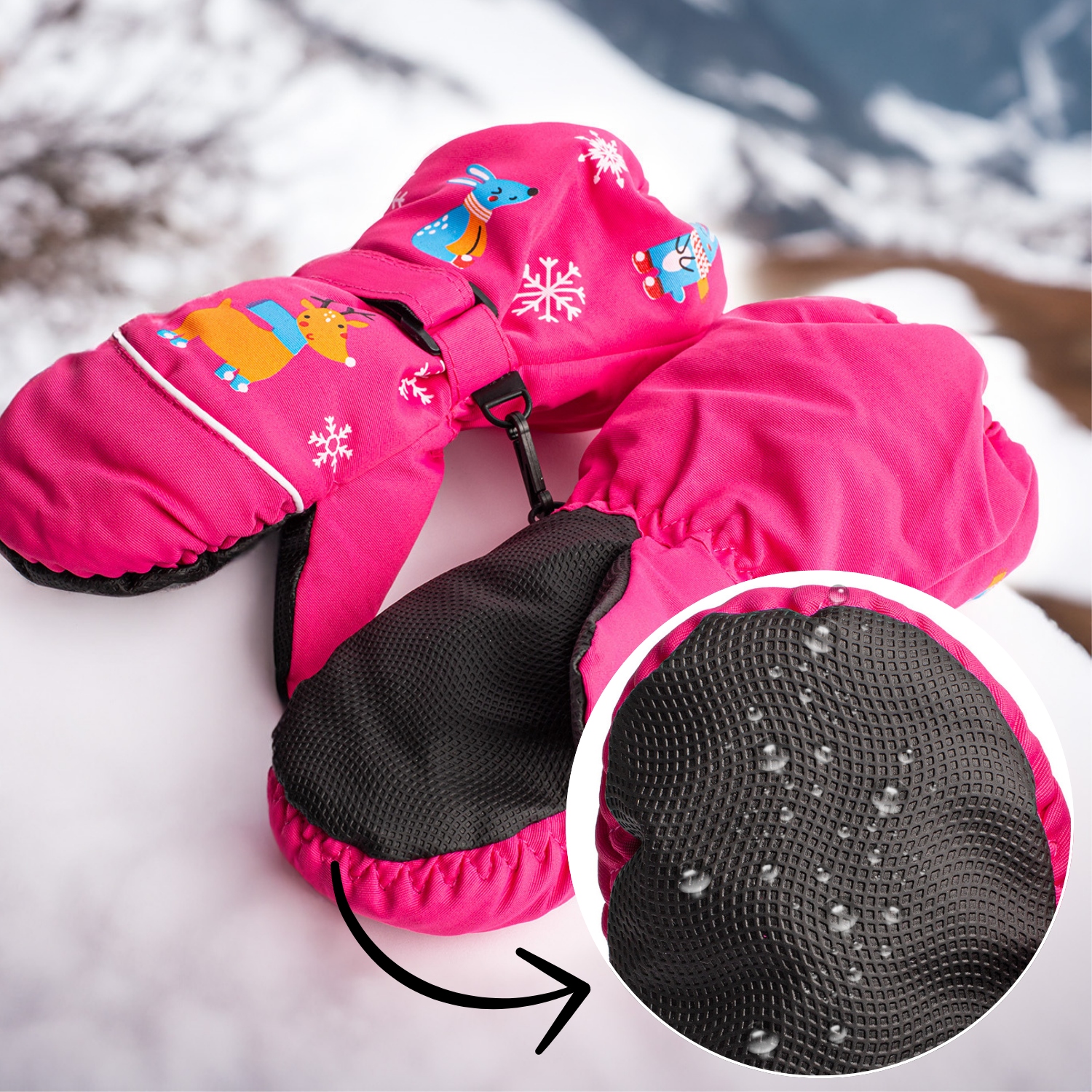 Перчатки имеют практичный ремешок на липучке, который позволяет легко регулировать их по запястью ребенка. Благодаря этому перчатки остаются на месте, даже во время интенсивных движений или игры. Регулируемая застежка также предотвращает попадание холодного воздуха внутрь, что еще больше повышает тепловой комфорт.