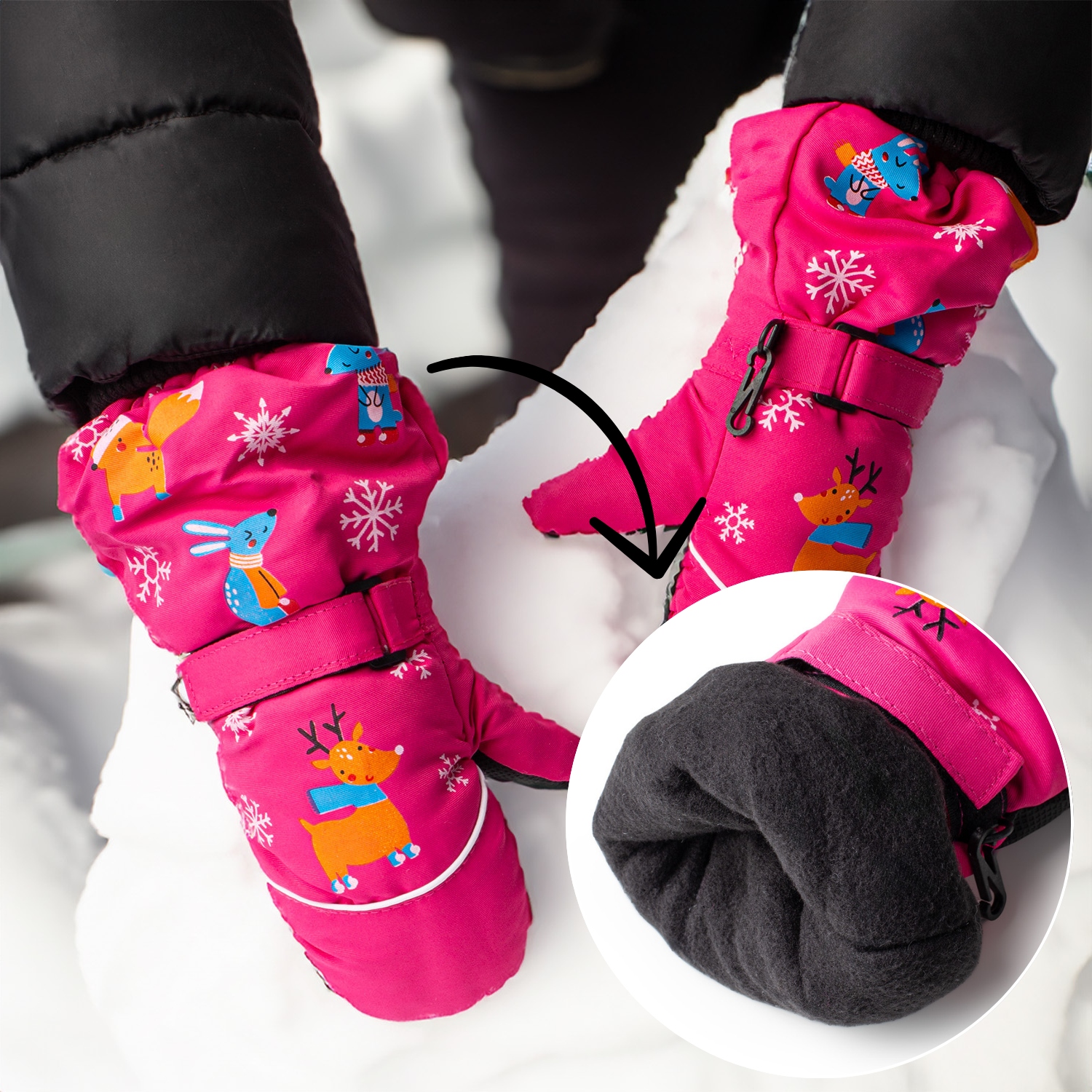 Внутренняя часть перчаток отделана мягким, теплым флисом, приятным на ощупь и нежным для кожи ребенка. Толстый изоляционный слой обеспечивает отличную теплоизоляцию, сохраняя тепло даже при очень низких температурах. Это идеальное решение для детей во время зимних прогулок и игр на свежем воздухе.