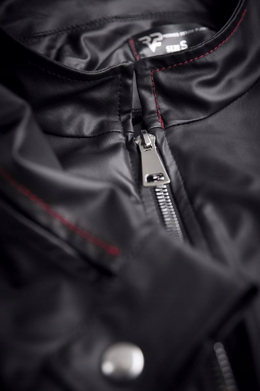 Короткая куртка, вдохновленная классической формой курток флаеров. Он полностью изготовлен из высокого класса, черного ветеринара. Короткий воротник на шее. В передней части в нижней части дна и с рукавами декоративные, металлические прессы. Закреплен с серебряной машиной с декоративным подвеской с логотипом RFP. Красная, декоративная строчка и красная метка с алькантарой с логотипом RFP, подчеркивают заботу об уникальных и характерных деталях. Идеально подходит для повседневных стилей
