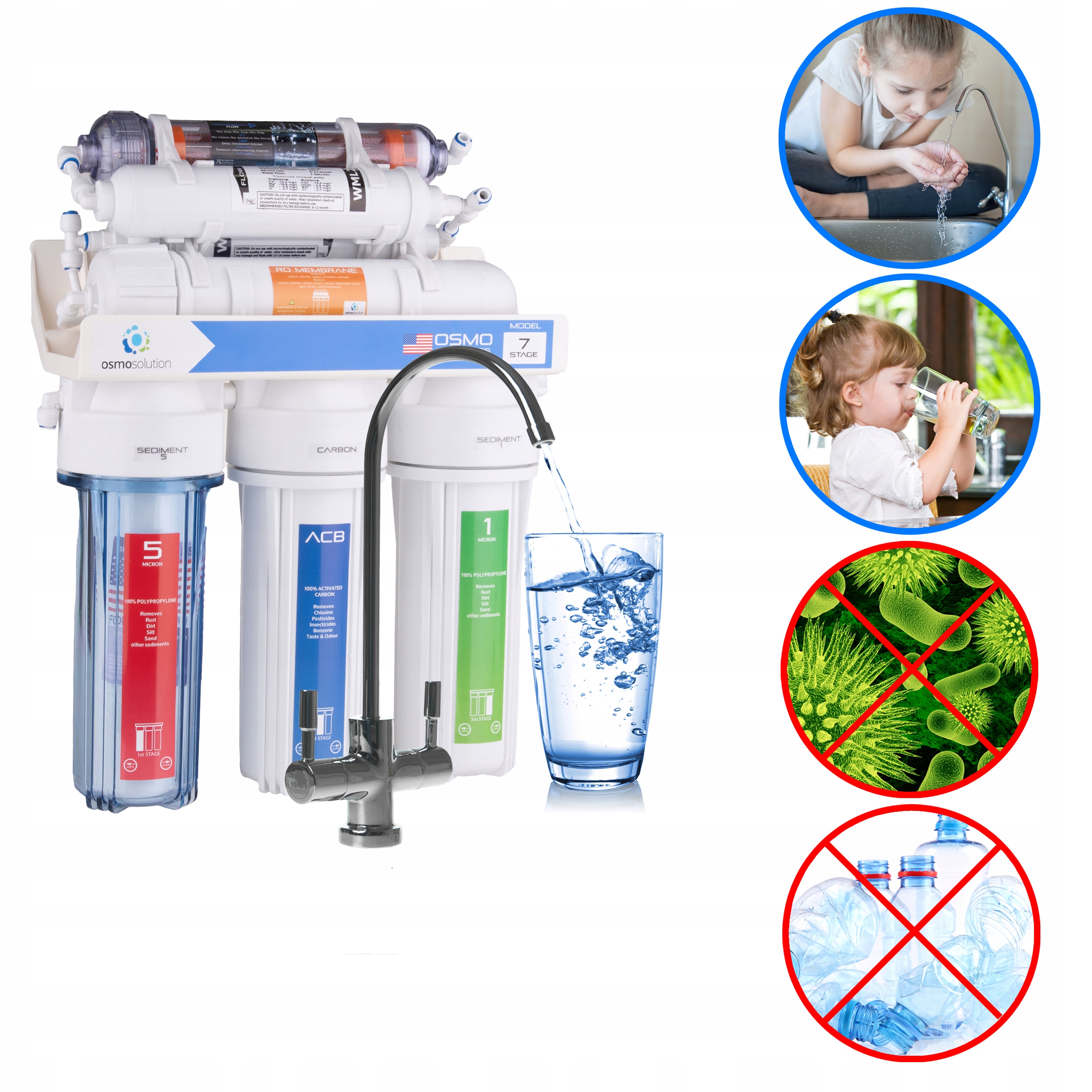Вода, проходящая через систему, подвергается 7-ступенчатой фильтрации, которая состоит из: