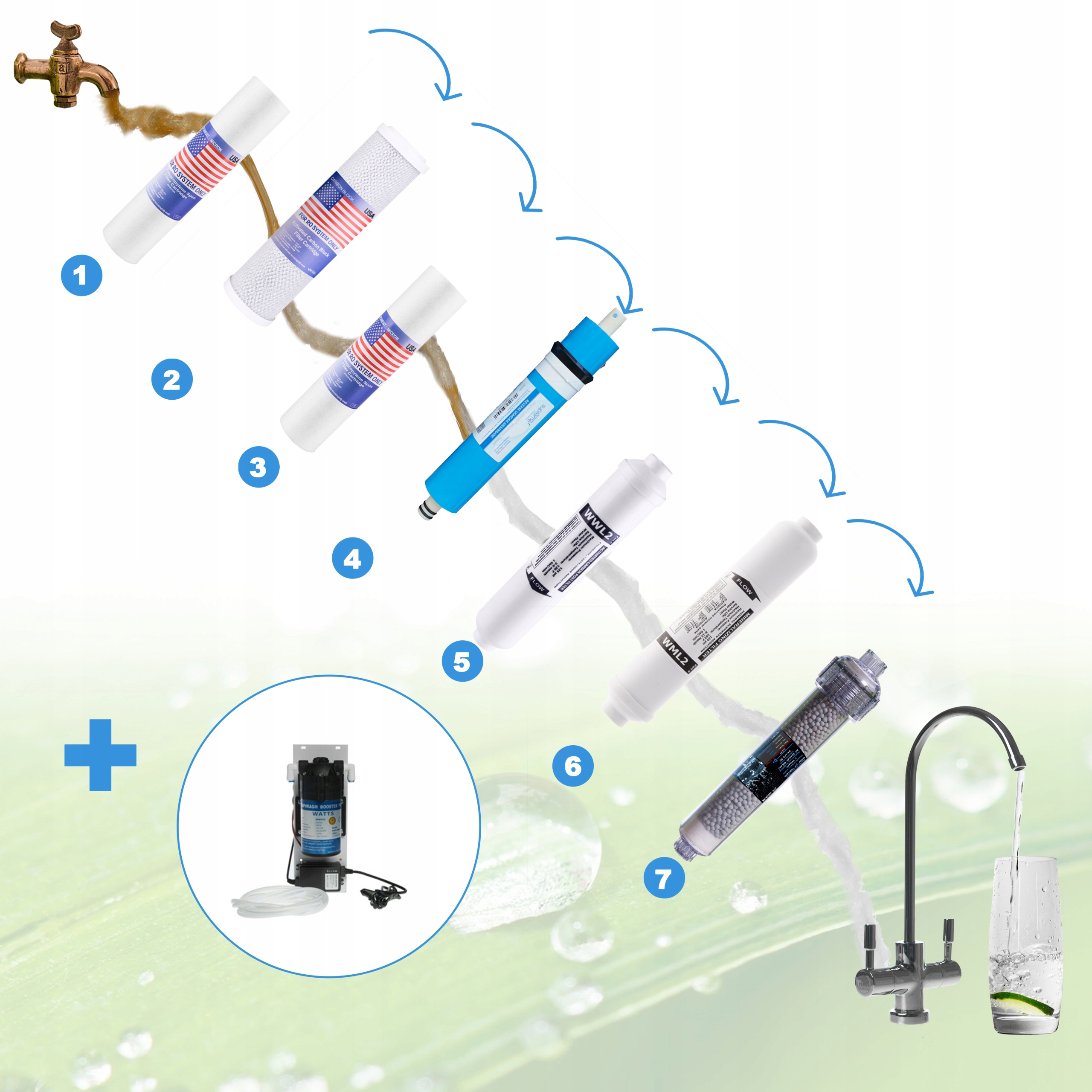 Вода, проходящая через систему, подвергается 8-ступенчатой фильтрации, которая состоит из: