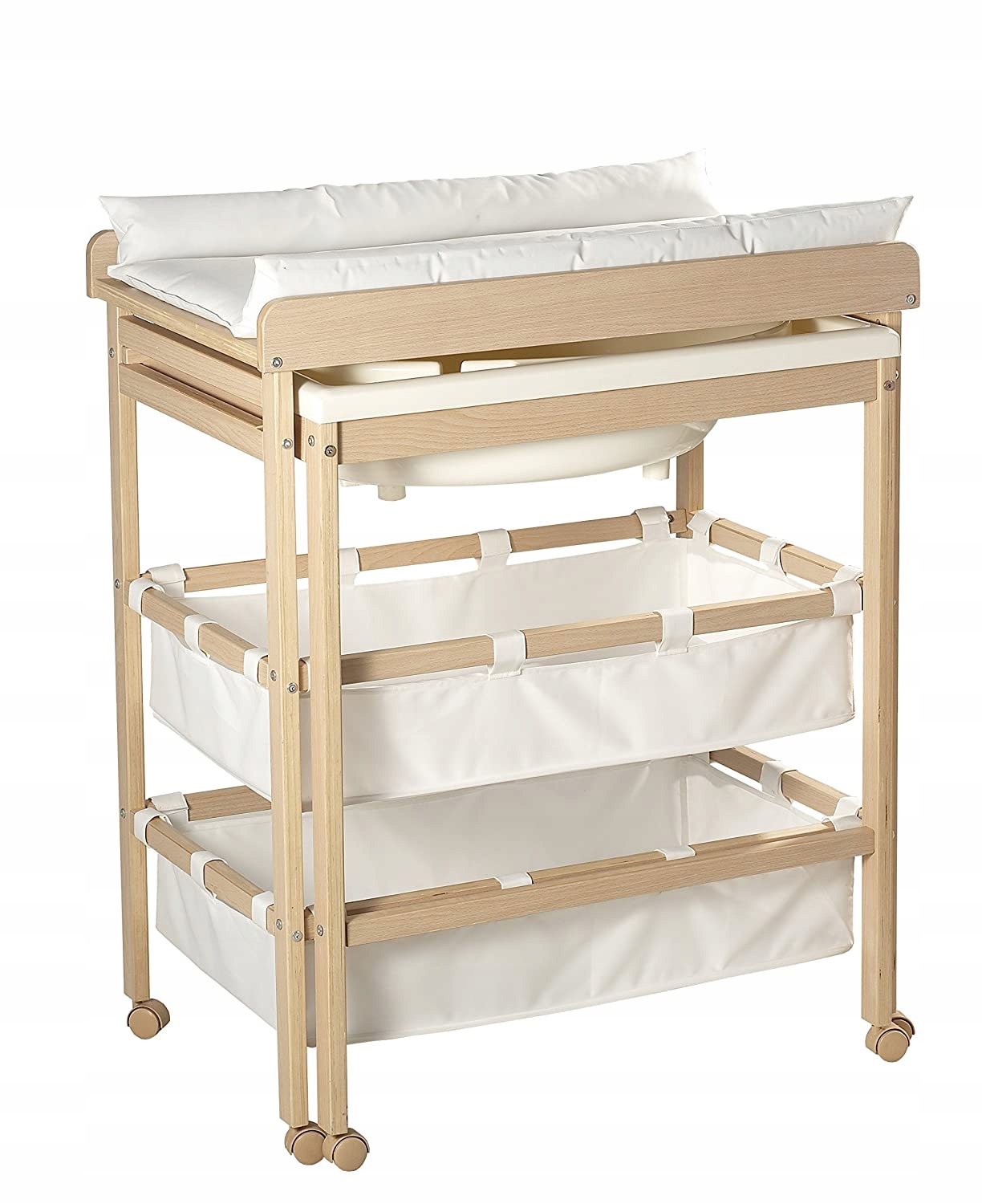 Благодаря колесам, интегрированная ванна может быть покрасена и вставлена под изменяющимся столиком, чтобы сохранить место