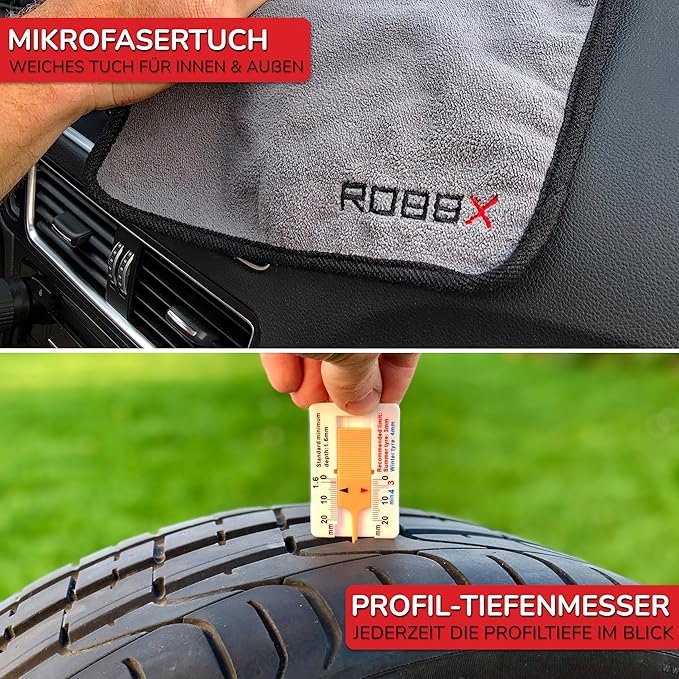 - Комплексный пакет – мы предоставим все необходимое и даже больше. Помимо чистящих салфеток и скребка для номерного знака, также имеется салфетка из микрофибры и индикатор глубины протектора.