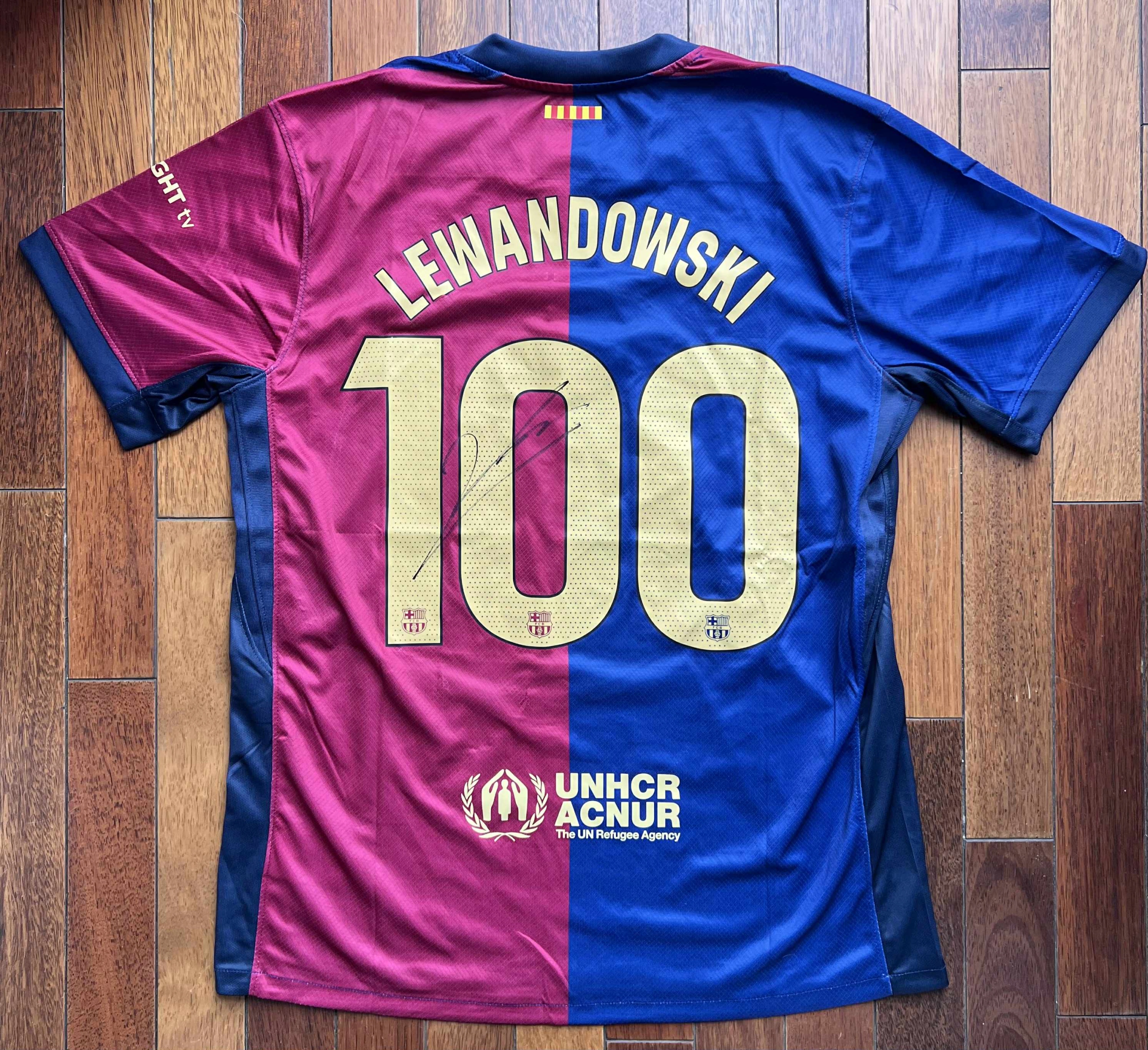 Футболка ограниченного выпуска с номером 100 по случаю забивания 100 голов за ФК Барселона, с автографом Роберта Левандовски. Уникальная вещь для любителей футбола. В комплект входит сертификат подлинности в виде наклейки с QR-кодом, выданный известной американской компанией.