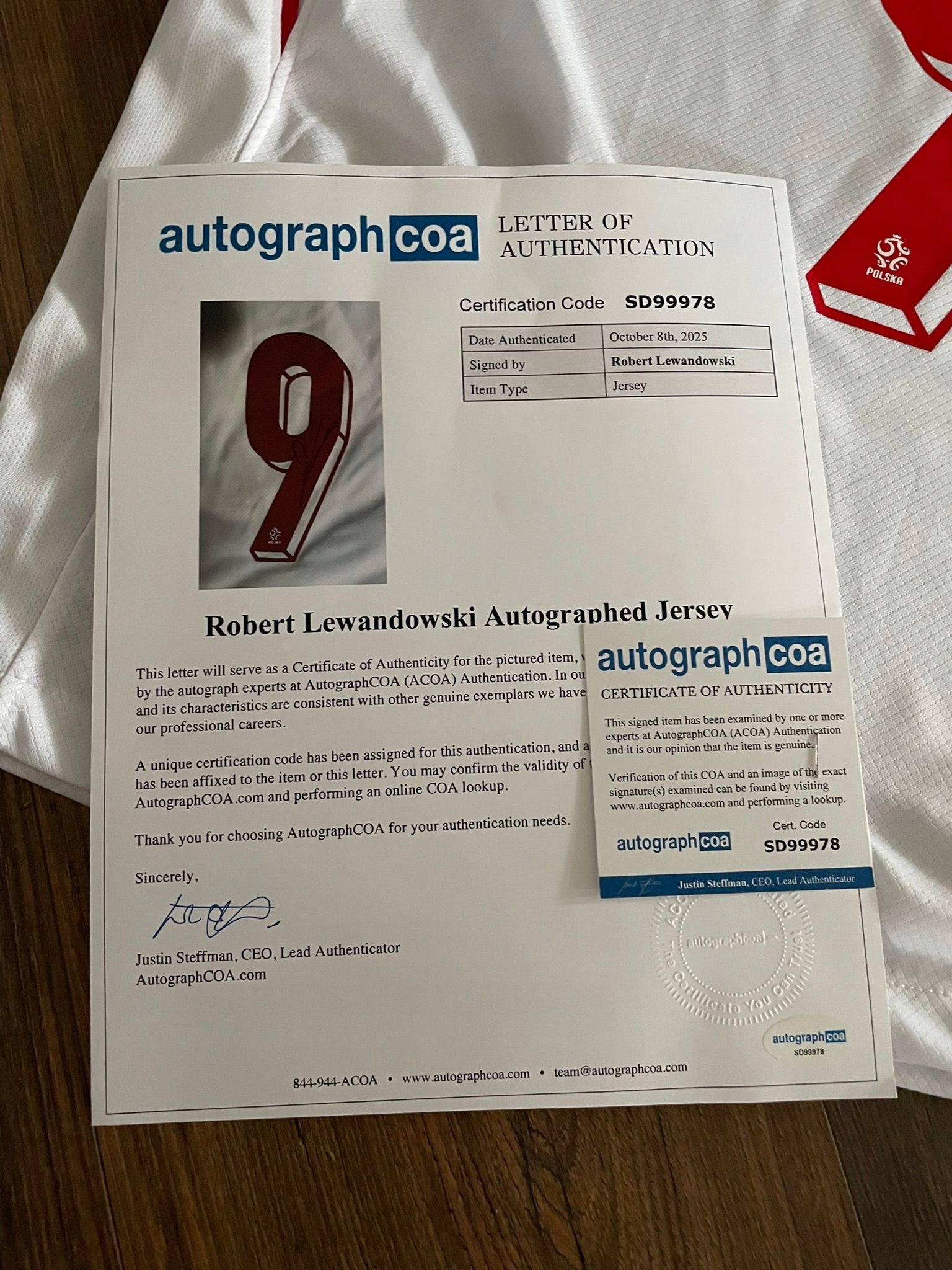 Футболка имеет сертификат подлинности, подтверждающий подлинность автографа, что делает ее не только символом спортивного увлечения, но и ценной инвестицией коллекционера.