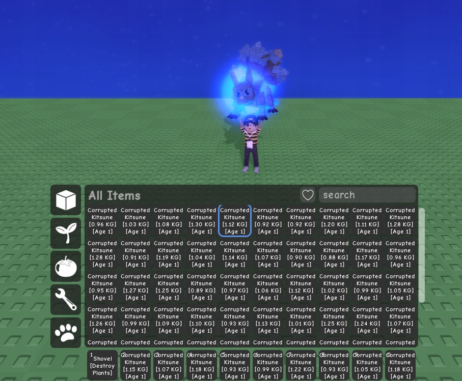Corrupted Kitsune - это таинственная лиса, рожденная от проклятой энергии, чьи девять хвостов горит темным огнем. Его присутствие нарушает рост растений и увеличивает шансы загрязненных мутаций. Вы можете получить его с грудью Kitsune с очень редкой вероятностью 1%.