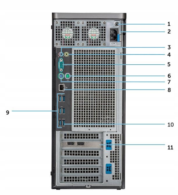 1. Индикатор BIST источника питания | 2. Разъем кабеля питания | 3. Гнездо для микрофона/линейного входа | 4. Разъем линейного выхода | 5 . Последовательный порт 6. Разъем PS/2 для мыши | 7. Разъем PS/2 для клавиатуры | 8. Сетевой разъем | 9. Порты USB 3.1 Gen 1 | 10. Порт USB 3.1 Gen 1 (поддерживает режим Smart PowerOn) | 11. Разъемы видеокарты ( DisplayPort; DVI)