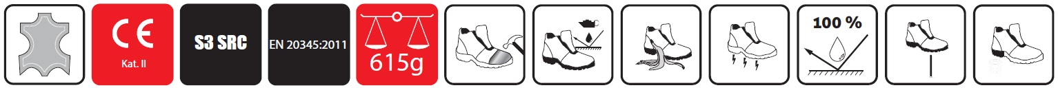 S3 - основные свойства (в т.ч. устойчивость носка к ударам энергией 200 Дж и раздавливанию до 15 кН), закрытая пяточная зона, антистатические свойства, поглощение энергии в пяточной части, устойчивость подошвы к дизельному маслу, стойкость верхней части на проницаемость и водопоглощение, устойчивость нижней части к проколам, моделирование подошвы.