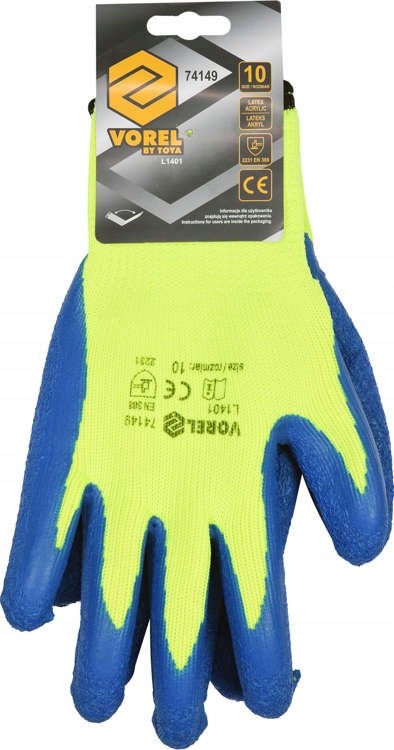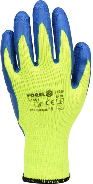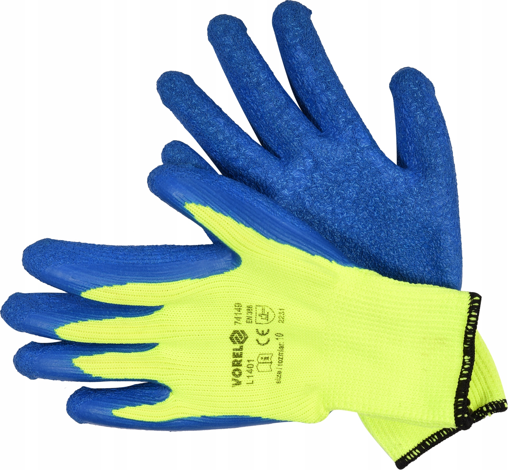 Изолированные защитные рабочие перчатки из ярко-желтого полиэстера, покрытые синим латексом в рукоятке. Перчатки созданы для защиты рук от механических воздействий.