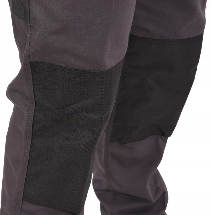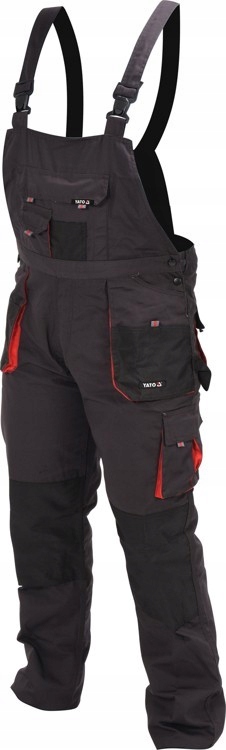 Рабочие штаны на брекетах, размер XXL, сшитый толстым устойчивым материалом на основе хлопка и полиэстера / 35% и 65% /. Черный с красными аксессуарами. У них есть четыре больших, сшитых кармана два спереди и два сзади и на ноге специального кармана для мобильного телефона. На передней панели на ногах сшитые армии из полиэфирной ткани, предназначенная для того, чтобы положить колени на коленях, лоскут на груди с двумя карманами и регулируемым креплением жгута.