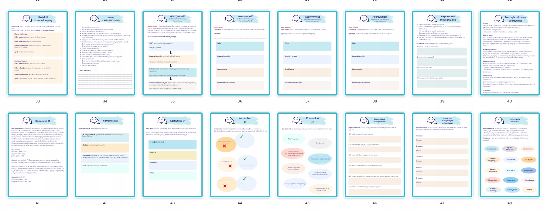 Коммуникативные навыки являются одной из важнейших компетенций в профессиональной и личной жизни. Эффективное общение без насилия, с использованием напористой позиции помогает выразить наши чувства, потребности и достичь наших целей. Тетрадь «Коммуникация» представляет собой комплекс упражнений в привлекательной графической форме, который поможет вам попрактиковаться в общении и представить аспекты межличностного общения. Рабочие листы предназначены для коучей, терапевтов, тренеров и для вашей собственной работы. Они подготовлены на основе цикла Кольба, то есть обучения через опыт, в соответствии с философией, согласно которой ресурсы находятся внутри нас. , нам просто нужно их обнаружить, и пережитое сохраняется дольше. Из блокнота вы, среди прочего, узнаете, как давать обратную связь, реагировать на критику, как должна выглядеть открытая поза тела на презентации, как уверенно общаться, а также узнаете барьеры на пути к эффективному общению. Вы научитесь уверенному общению и поймете, почему вы не можете ладить с некоторыми людьми. Знание ассертивного общения улучшит ваши отношения и научит вас, как справляться с трудными социальными ситуациями.